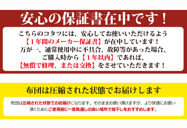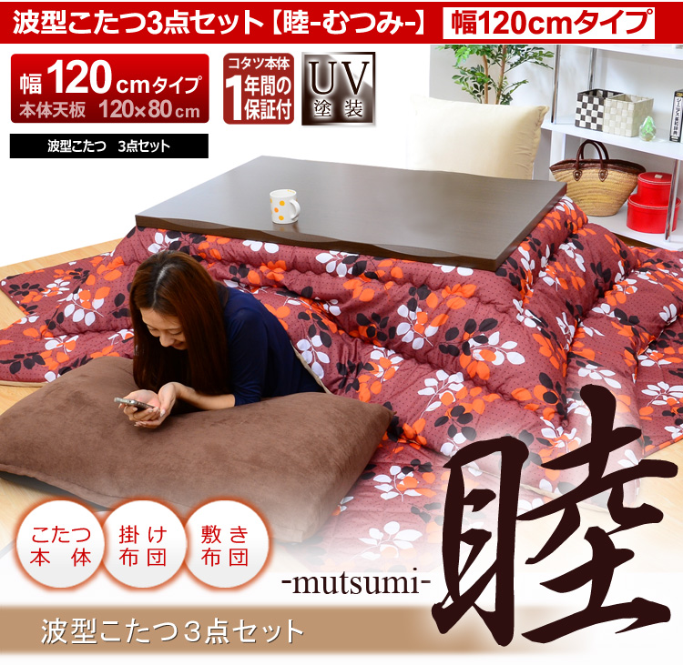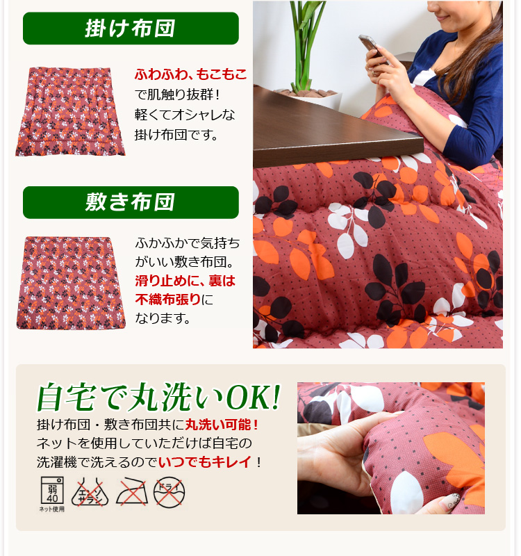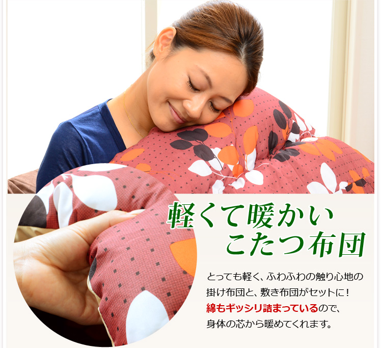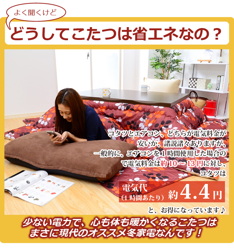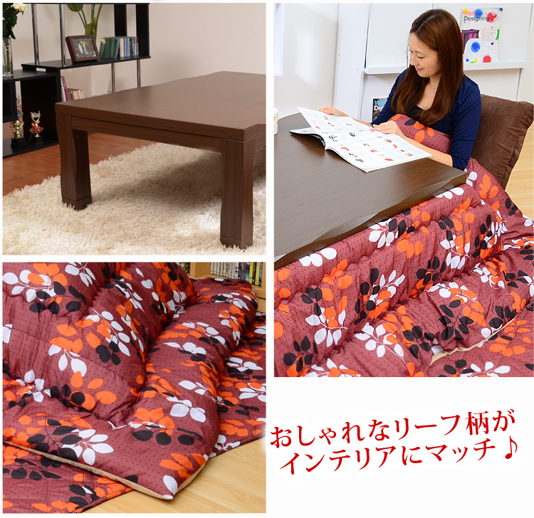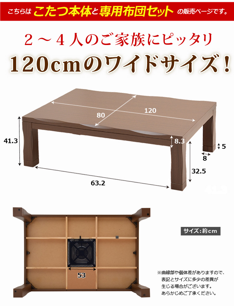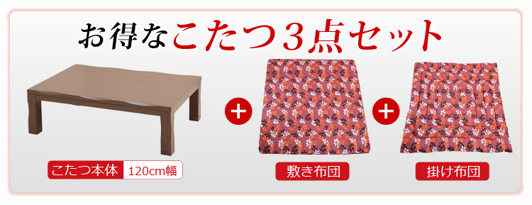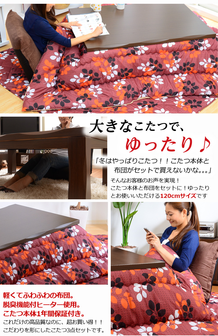 こたつ本体、敷き布団、掛け布団をセットでお届けします。サイズも120cmとゆったりとお使いいただけます。10畳のお部屋にぴったりのサイズになっております。