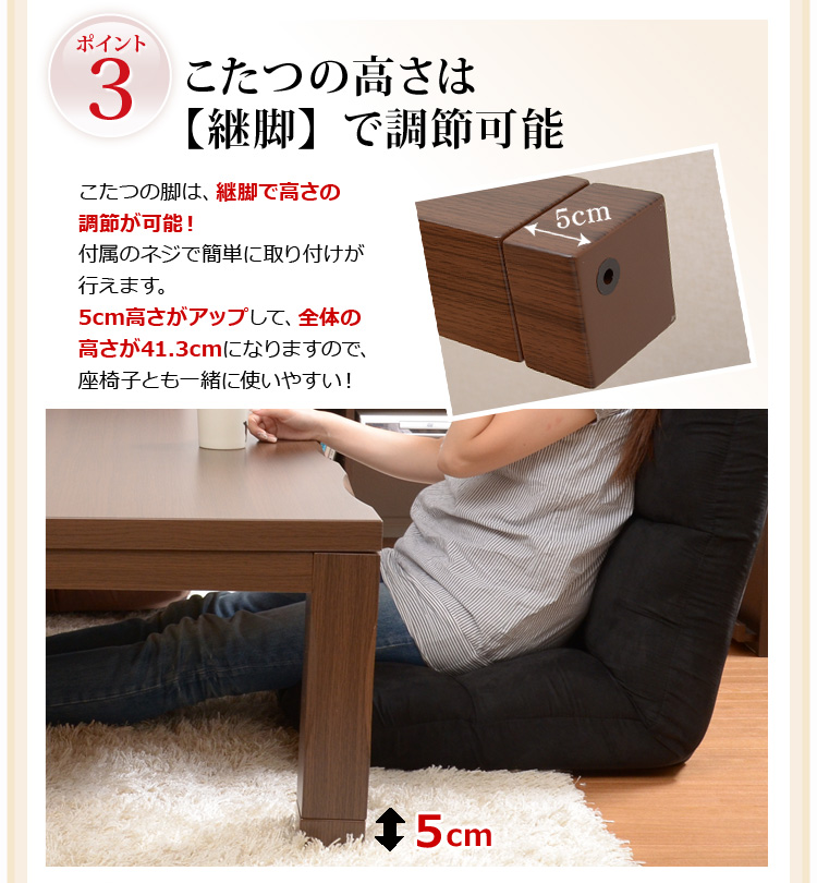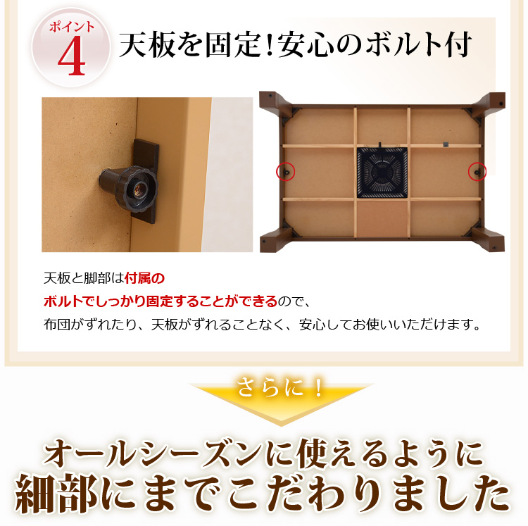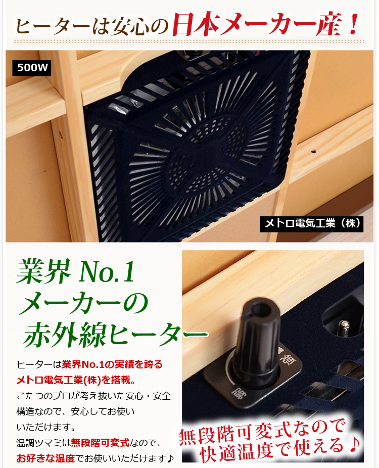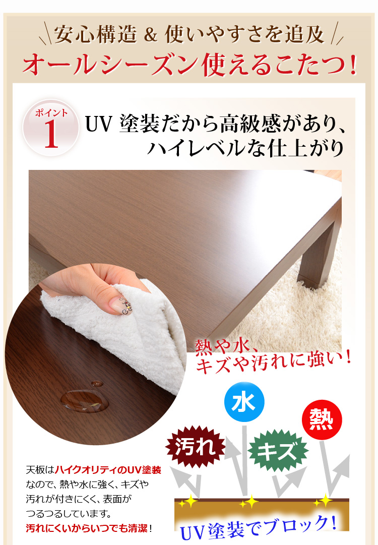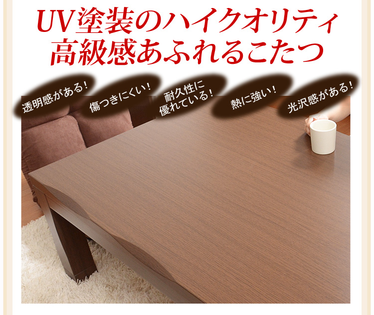 UV塗装で傷つきにくく、熱や水にも強いです。汚れにも強いのでいつでも清潔!透明感のあるこたつに仕上がっています!