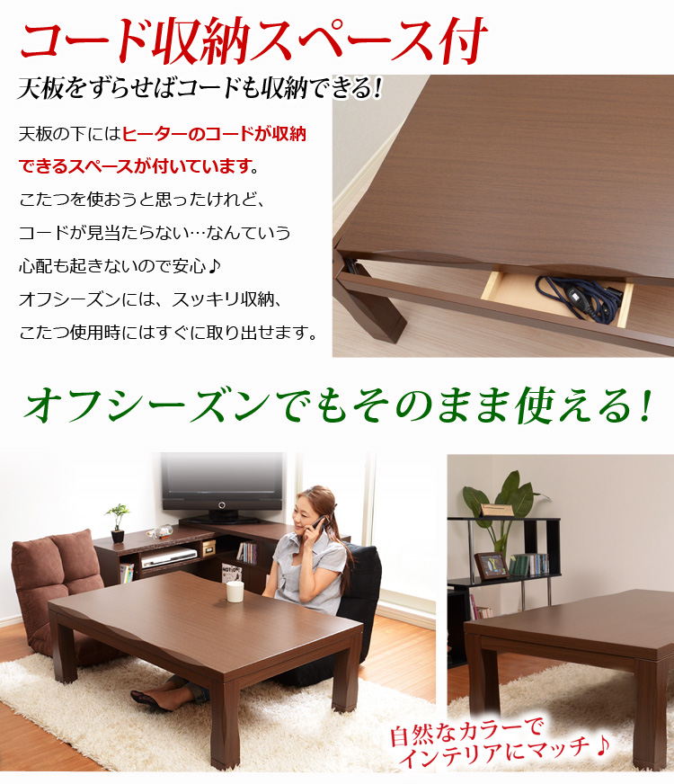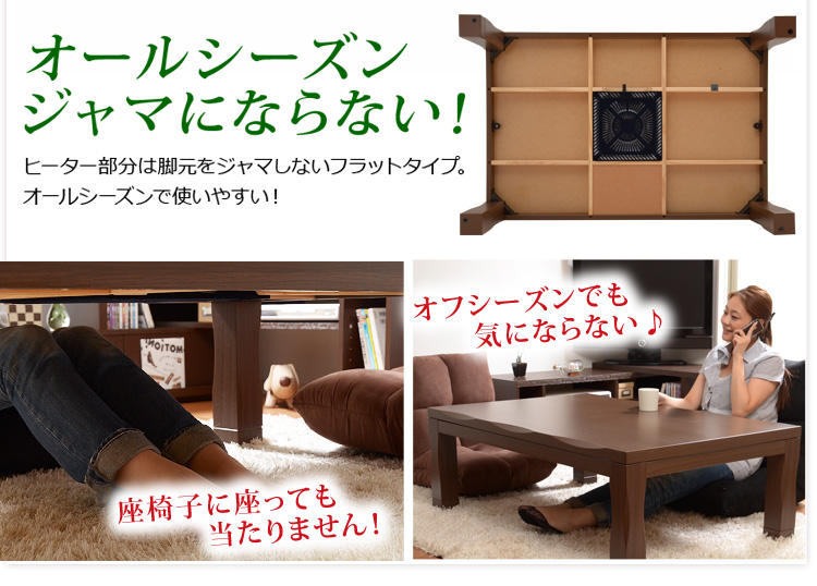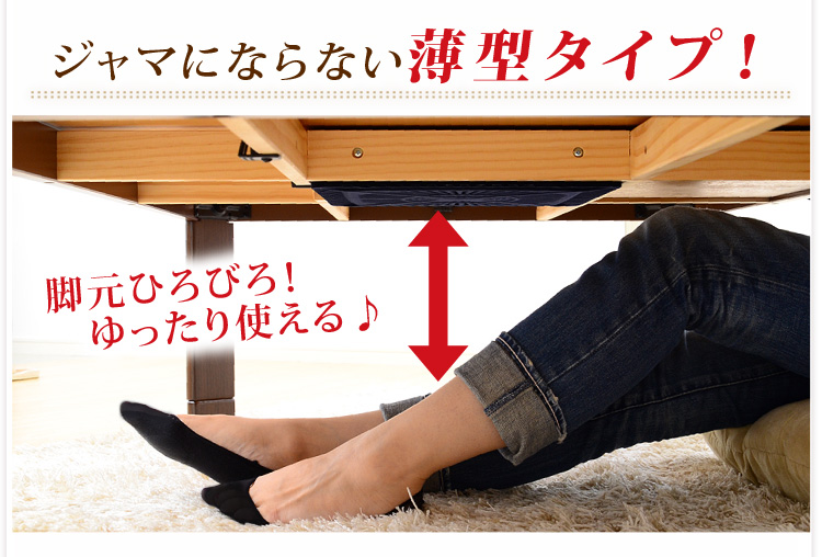 ヒーター部分はフラットタイプで足もとが邪魔になりません!また、コードを収納するスペースが付いているのでオフシーズンにはスッキリ収納できます!