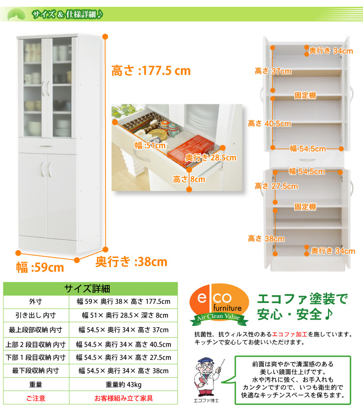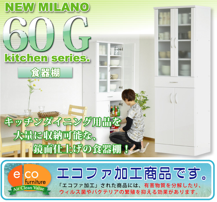 ニューミラノの食器棚は、有害物質の分解、ウィルス菌、バクテリアの繁殖を抑制をする「エコファ加工」を施しているので衛生面もしっかりしています!