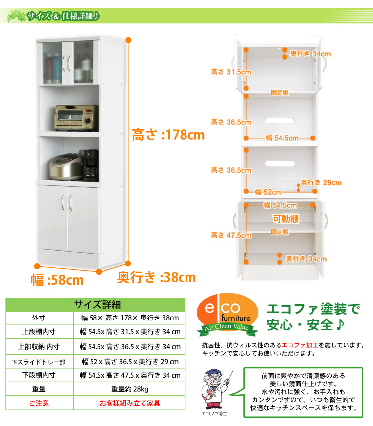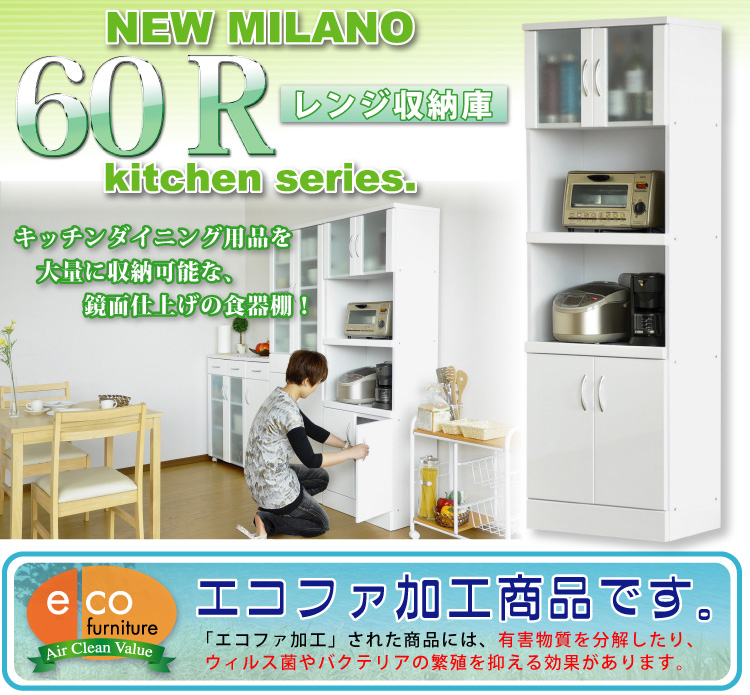 ニューミラノの食器棚は、有害物質の分解、ウィルス菌、バクテリアの繁殖を抑制をする「エコファ加工」を施しているので衛生面もしっかりしています!