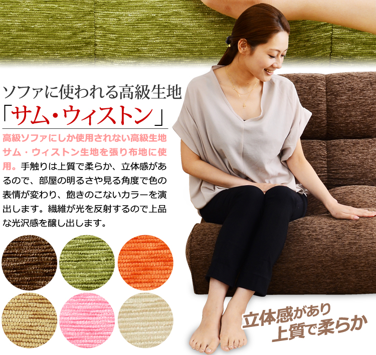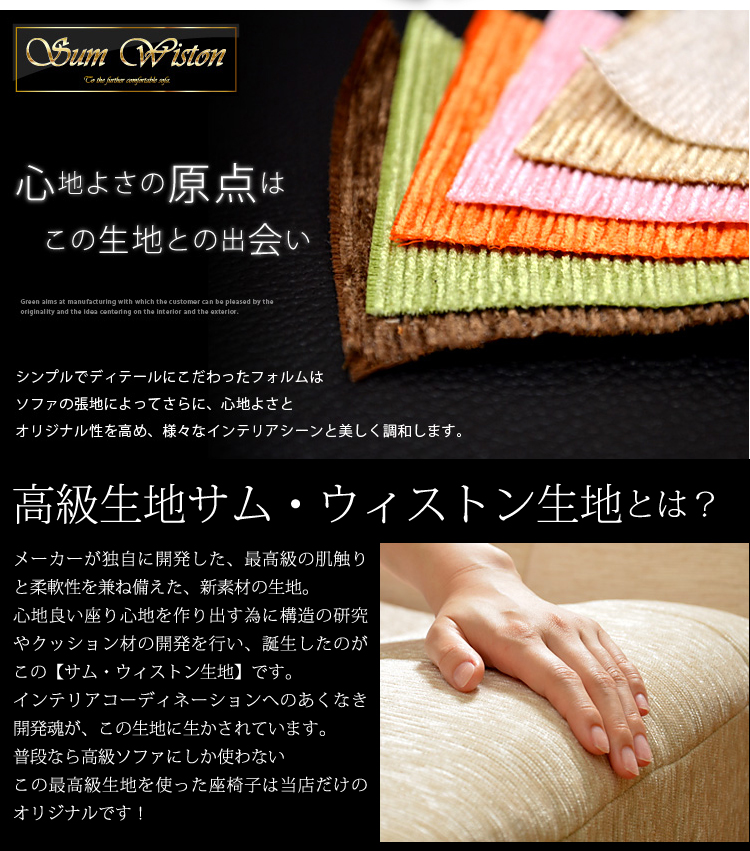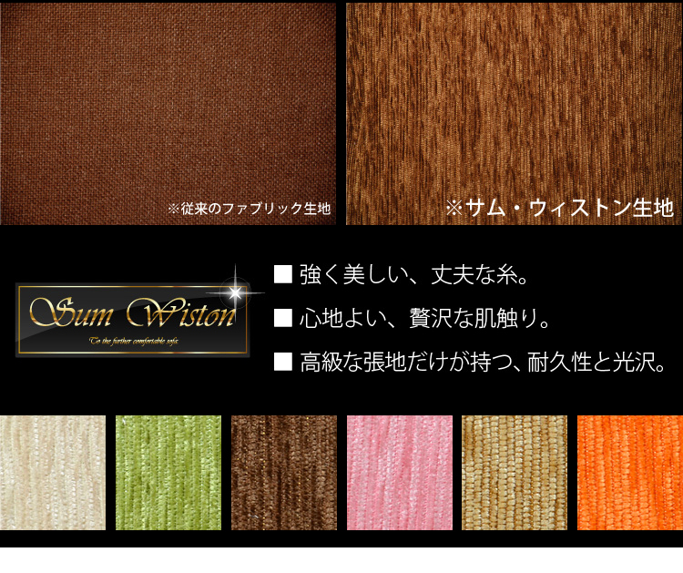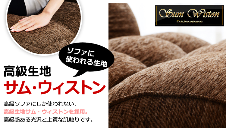 高級ソファに使われる、サム・ウィストン生地を使用しています。立体感があり、上質で柔らかな手触りで耐久性にも優れている高級生地です。