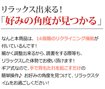 細かく調節できるよう、14段階のリクライニング機能が付いてます!きっと自分好みの角度が見つかるはず!