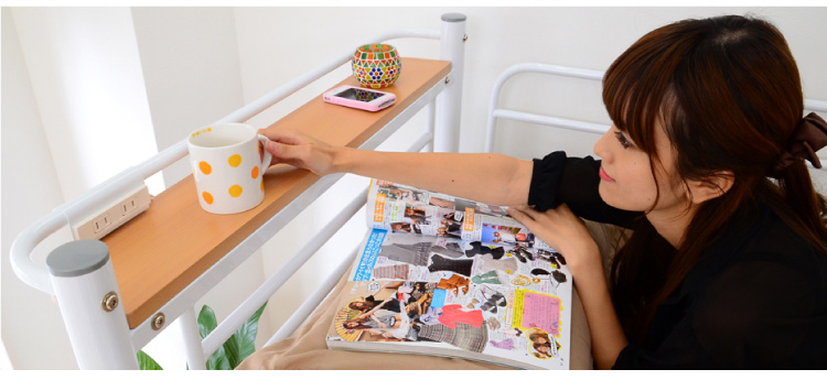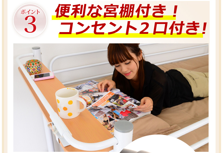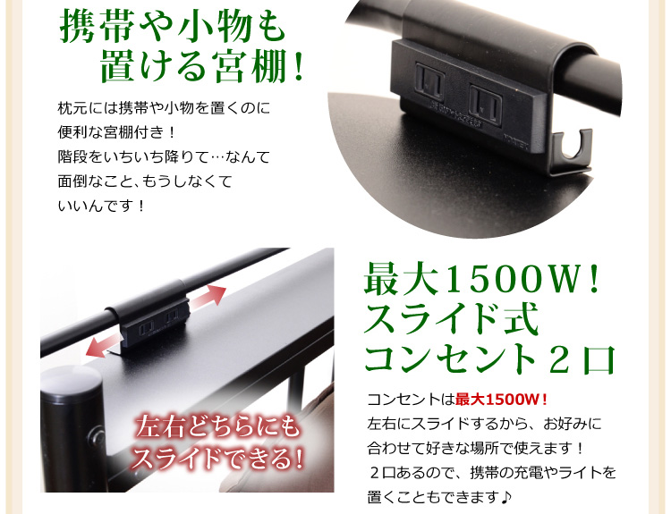 小物や携帯、スマホを置ける宮棚と、スライド式コンセント2口付いているので非常に便利!