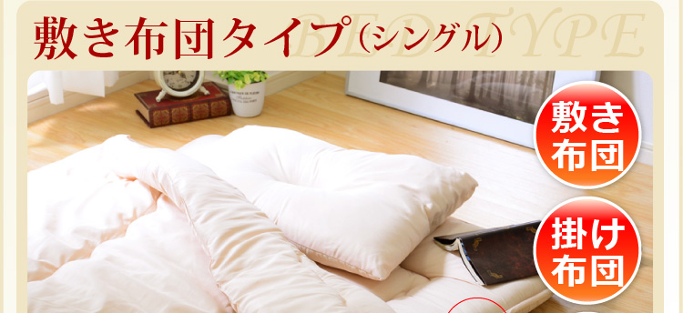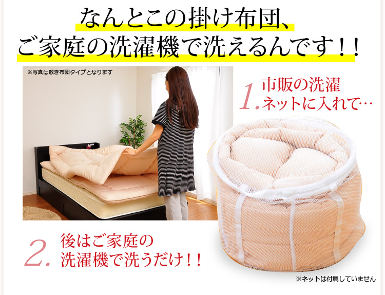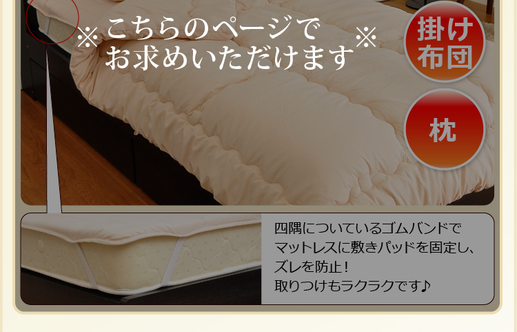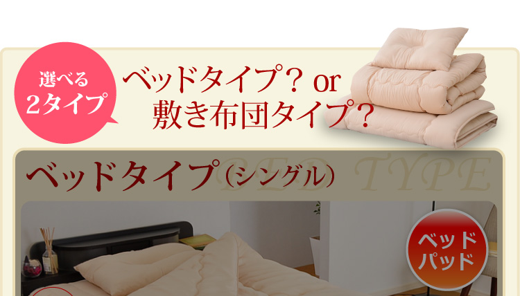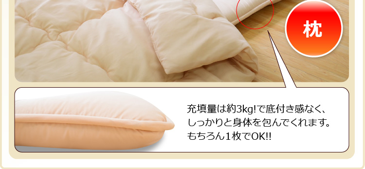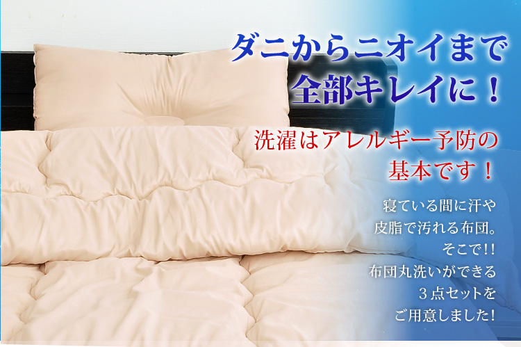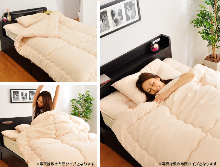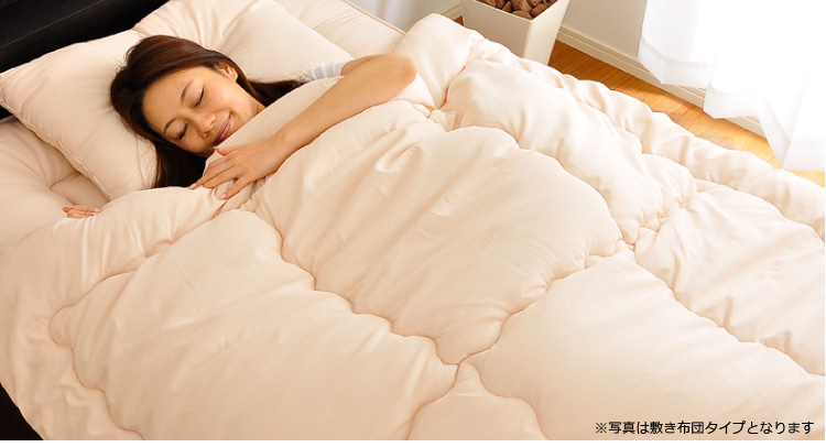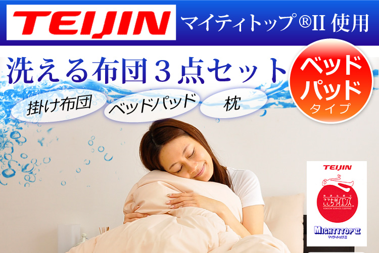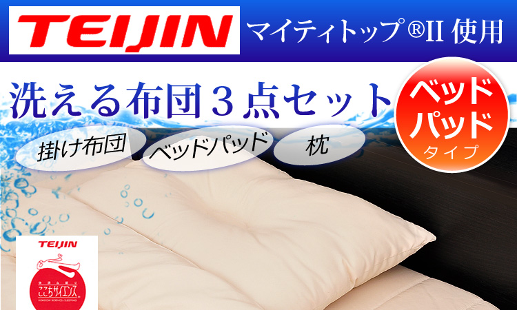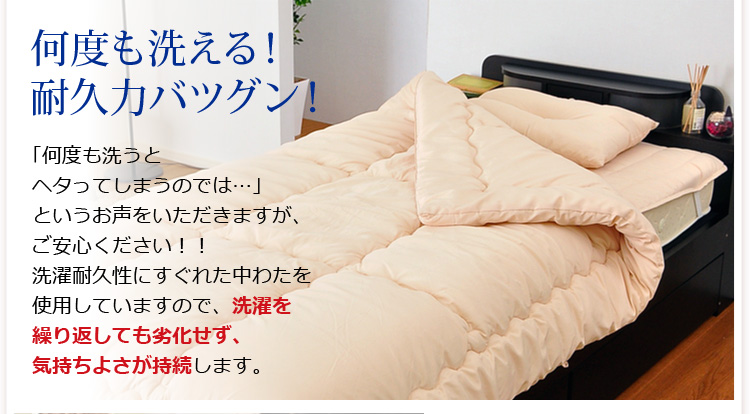 ベッドパッドタイプの掛け布団、ベッドパッド、枕の3点をお届けします。何度も洗っても劣化しない耐久力抜群の布団です!