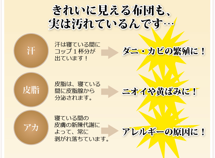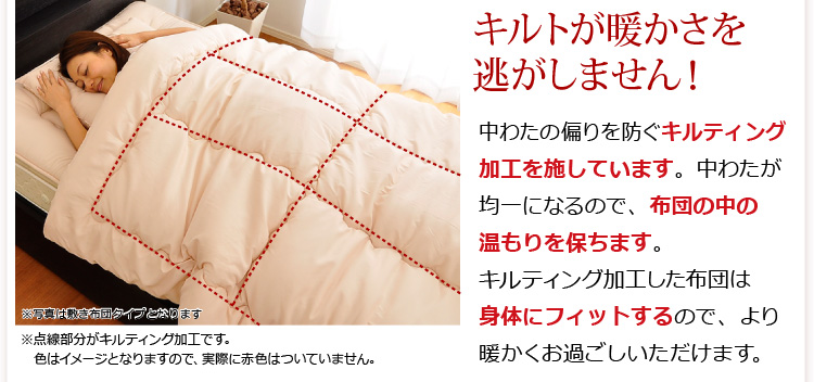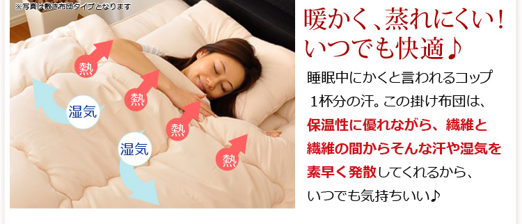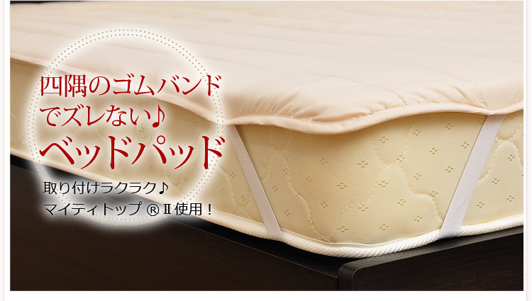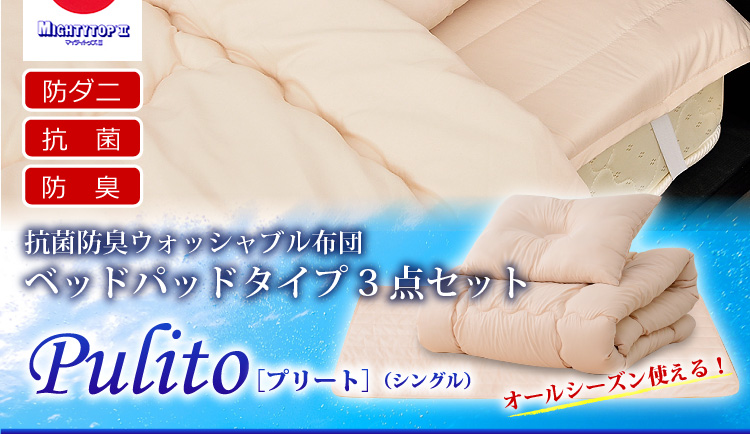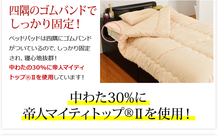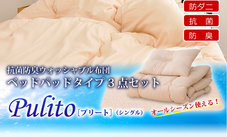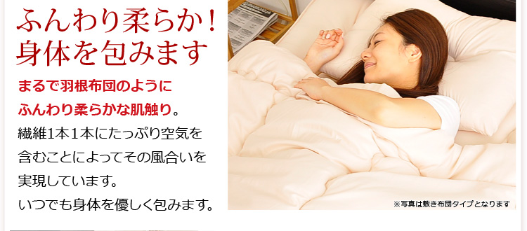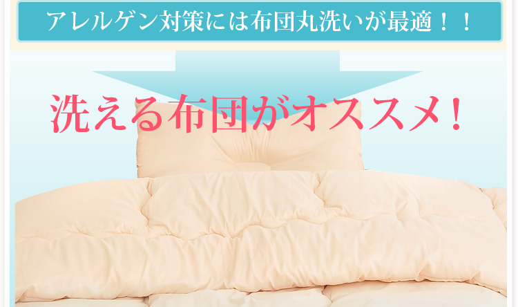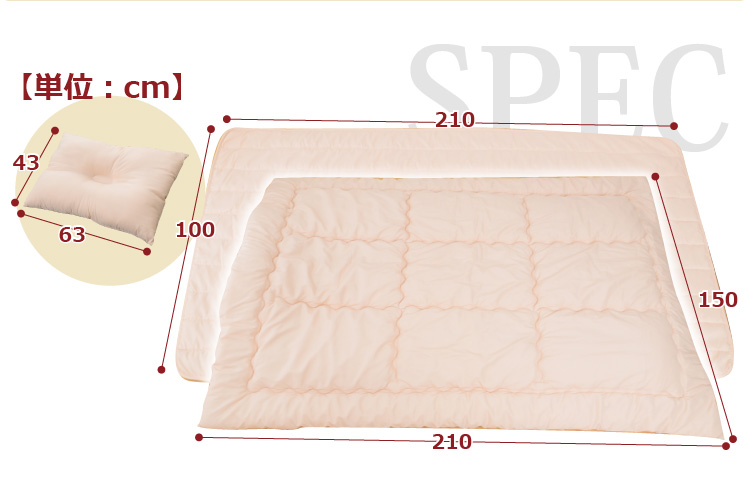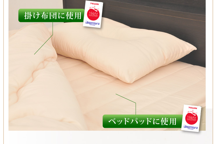 ベッドパッドタイプの掛け布団、ベッドパッド、枕の3点をお届けします。何度も洗っても劣化しない耐久力抜群の布団です!
