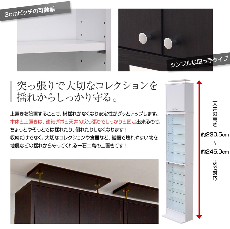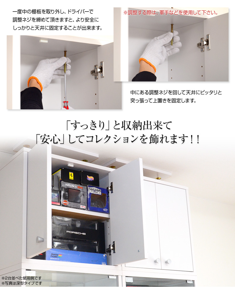 本体と上置きを合わせて天井の出っ張りでしっかりと固定すれば、耐震対策にもなり、大切なコレクションを守ります!