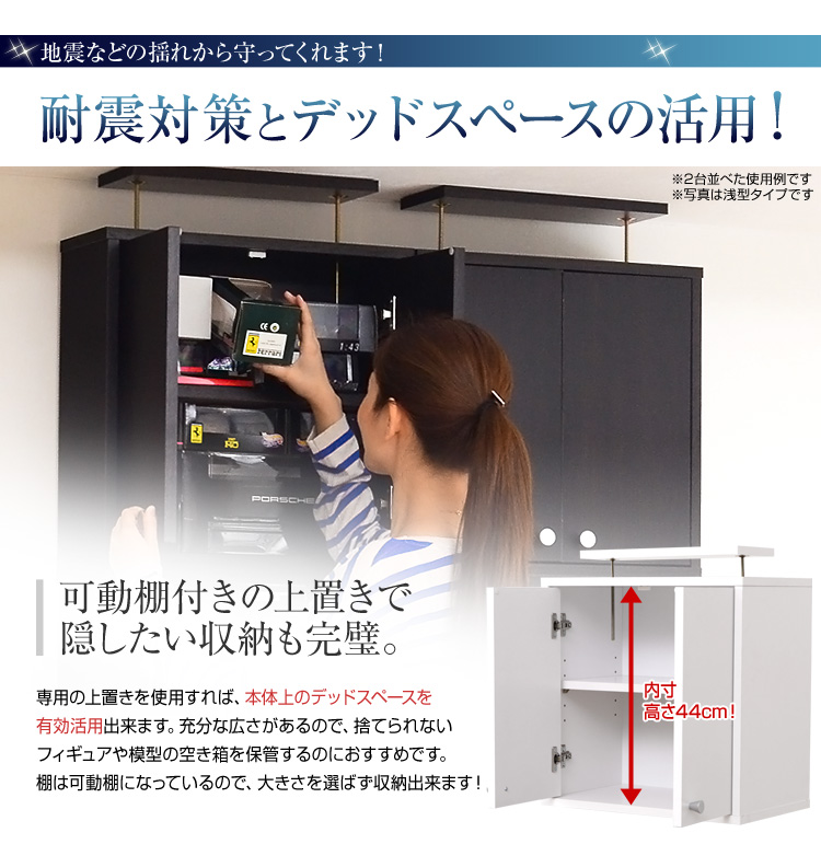 可動棚付きの上置きがあるので、本体上のデッドスペースを有効活用!広さも十分なので模型の空き箱等の保管に!
