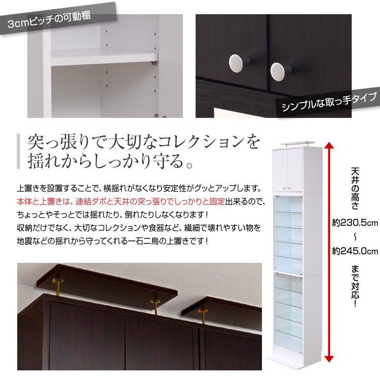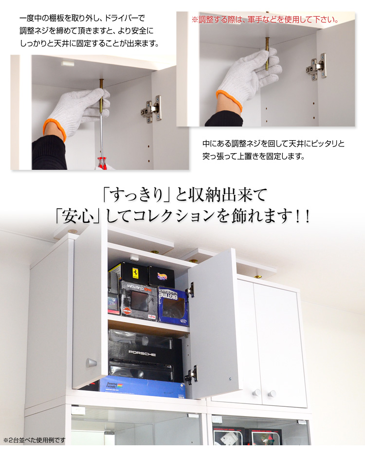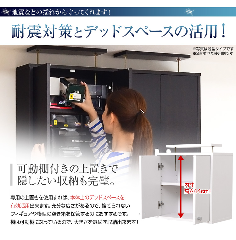 本体と上置きを合わせて天井の出っ張りでしっかりと固定すれば、耐震対策にもなり、大切なコレクションを守ります!