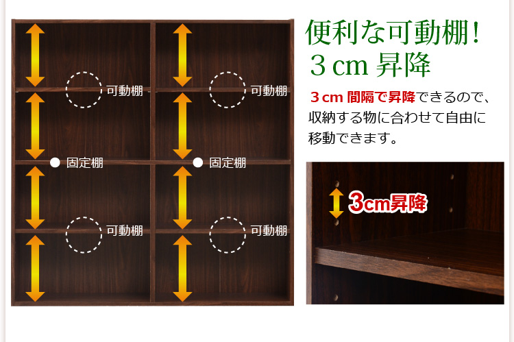 3cm間隔に移動できる可動棚が付いてるので、収納物に合わせて整理できます!