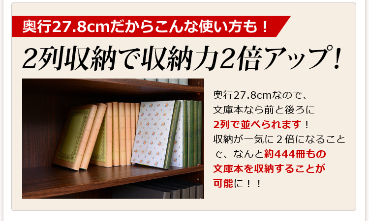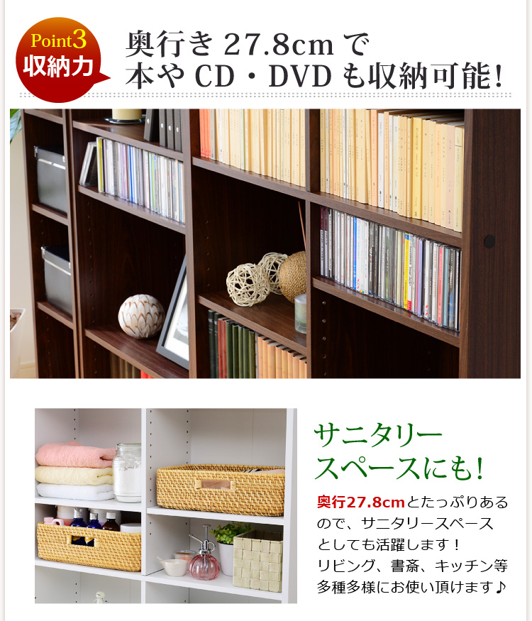 奥行き27.8㎝もあるので色々な物が収納できます!リビングや書斎、キッチン等、多種多様にお使いください!