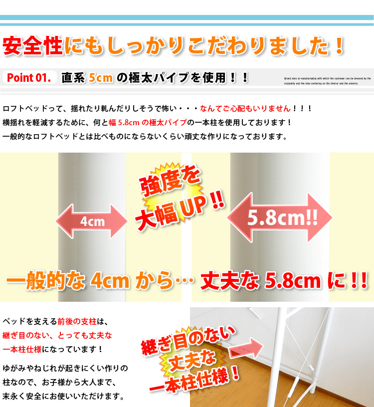 横揺れを軽減する5.8㎝の極太パイプを使用、軋みを防止する補強ワイヤーもついているのでとても頑丈な作りです!