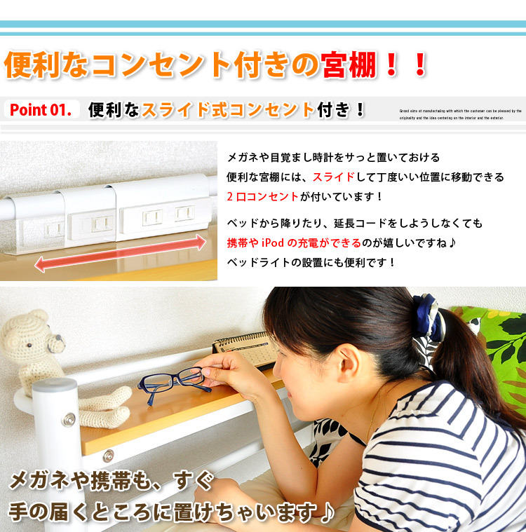 携帯、スマホの充電したり、ベッドライトを付けるのに便利なスライドできる2口コンセントとちょっとした小物が置ける宮棚が付いてます!