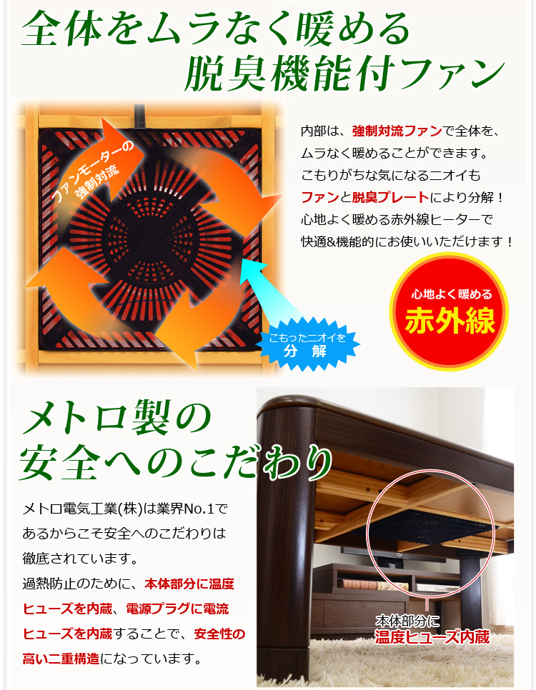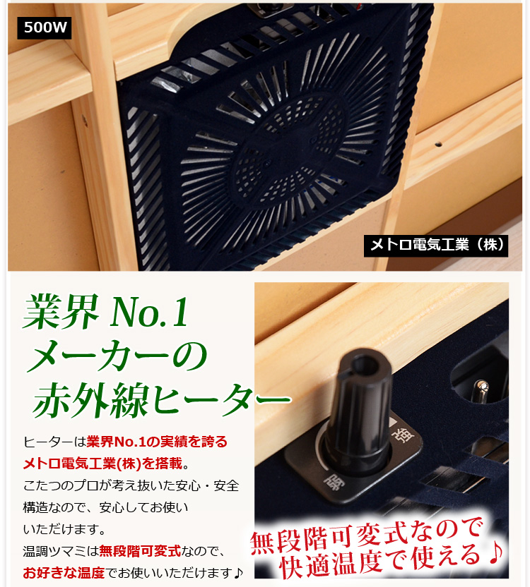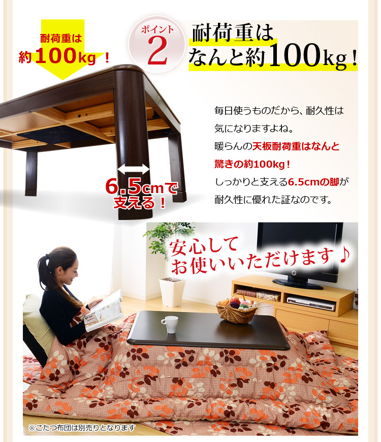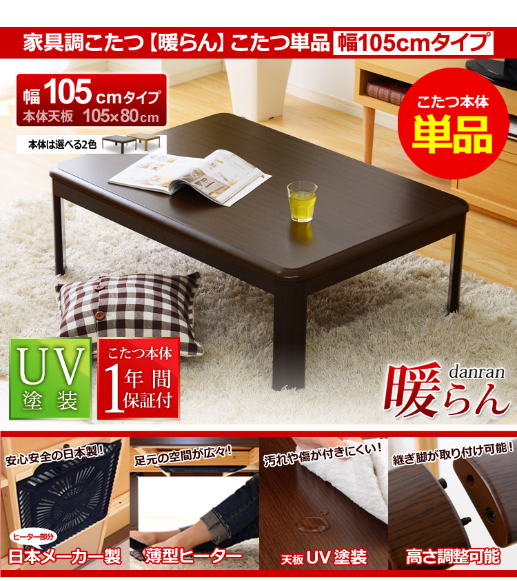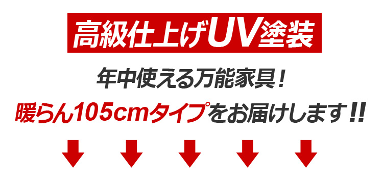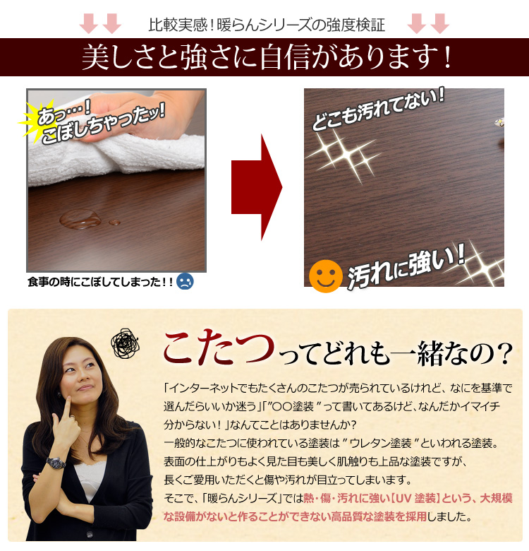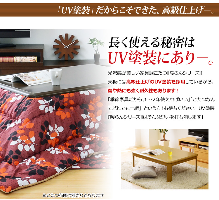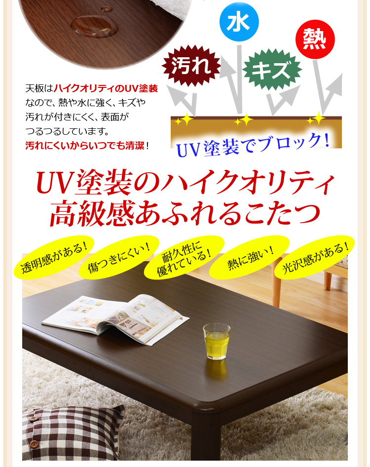 UV塗装で傷つきにくく、熱や水にも強いです。汚れにも強いのでいつでも清潔!透明感のあるこたつに仕上がっています!