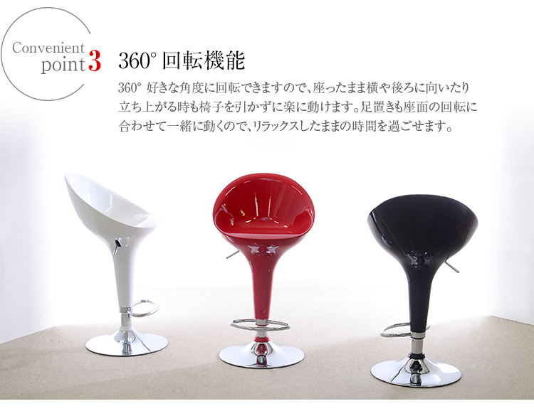 足置きが付いているのでいつも安定した座り心地です。360度回転しても座面の回転に合わせて足置きも一緒に動いてくれるのでリラックスして過ごせます!