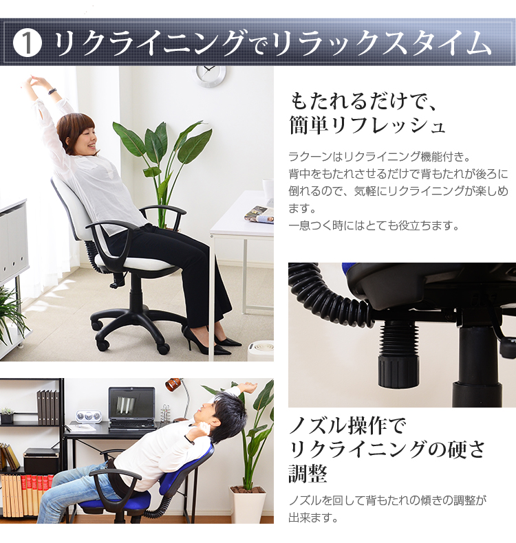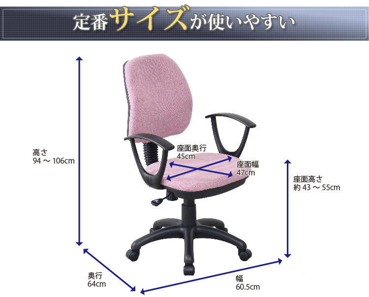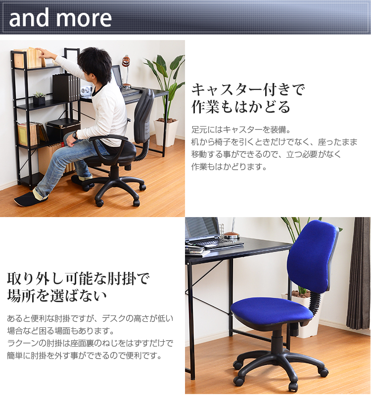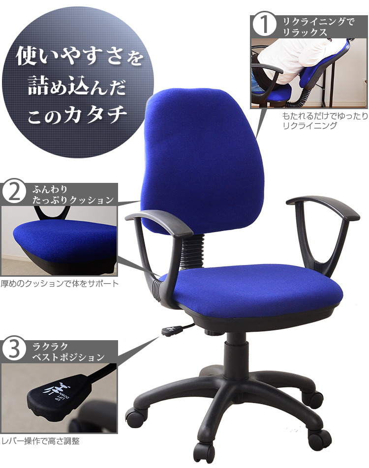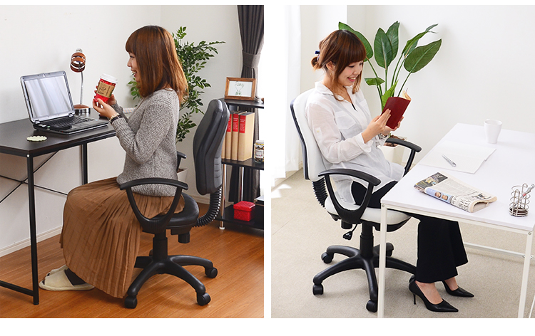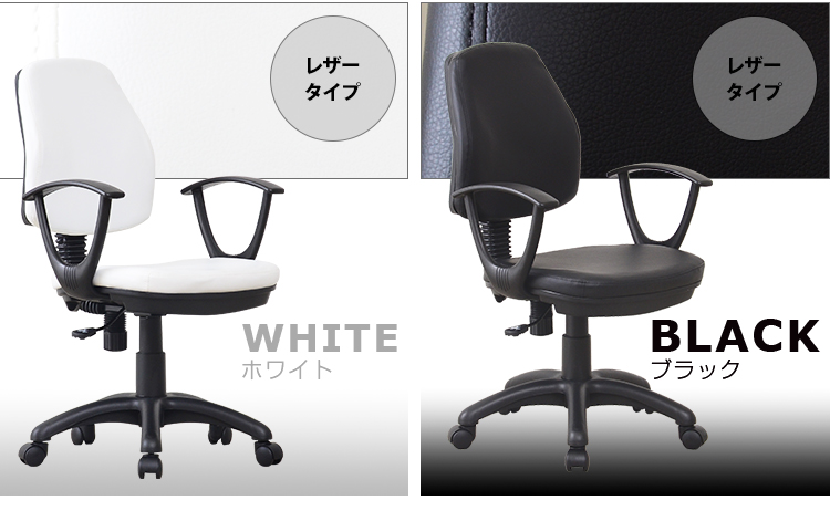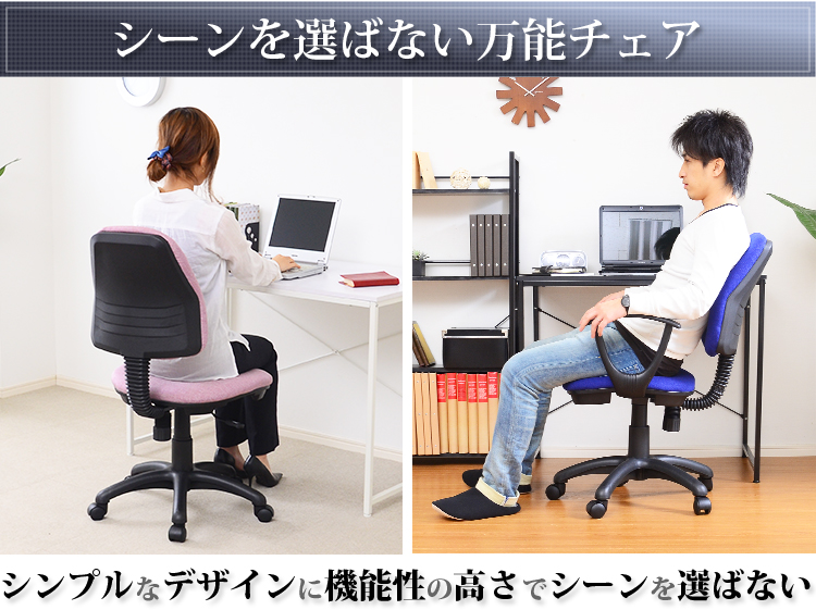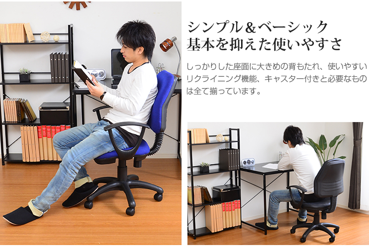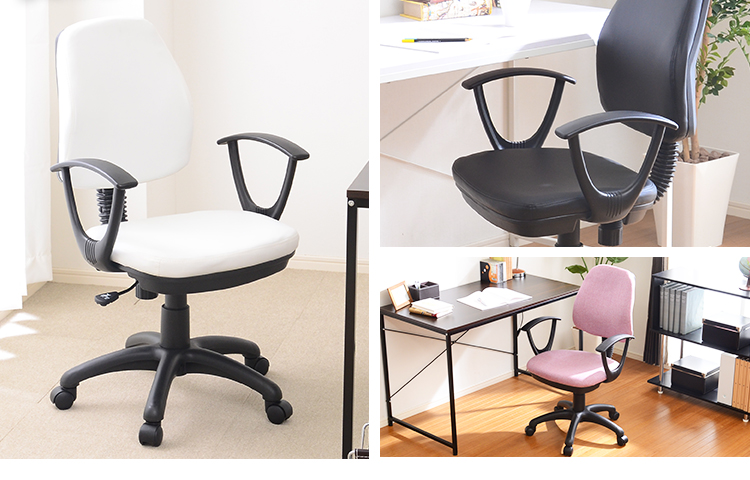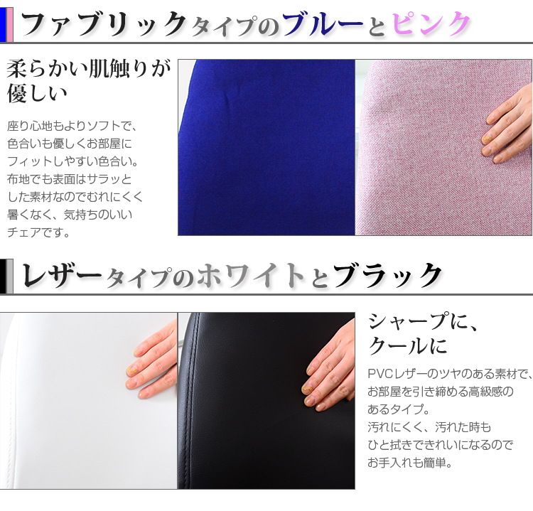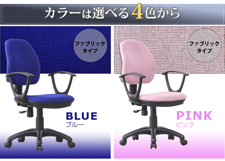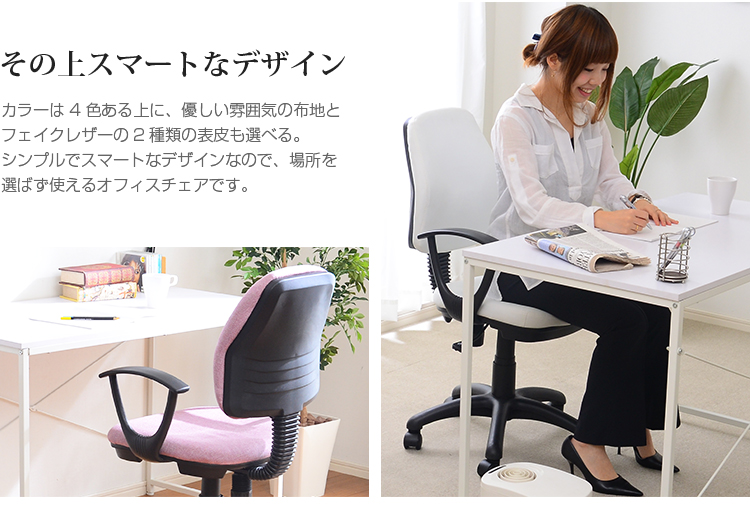 カラーは4色、布地とフェイクレザーの2種類の表皮を選べます。シンプルでスマートなデザインで場所を選ばないで使えるオフィスチェアです!
