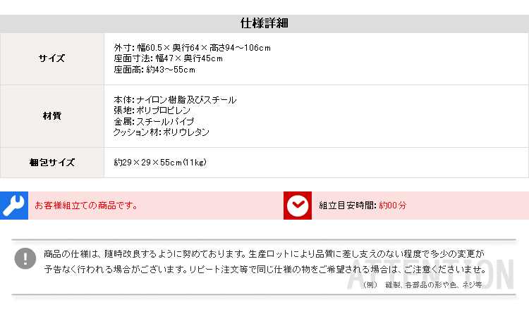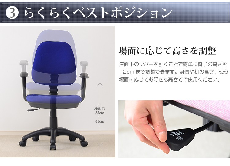 大きな背もたれとリクライニング機能、取り外し可能な肘掛、12㎝まで高さを調整できるレバー、キャスター付きと使いやすい機能が揃っています!