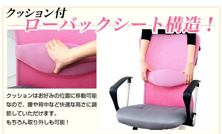 腰や背中などお好みの位置の高さに調節できるクッションが付いております。もちろん取り外しも可能です!
