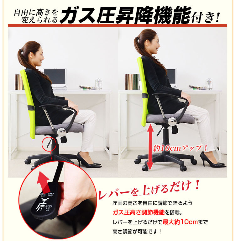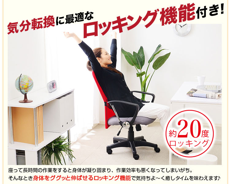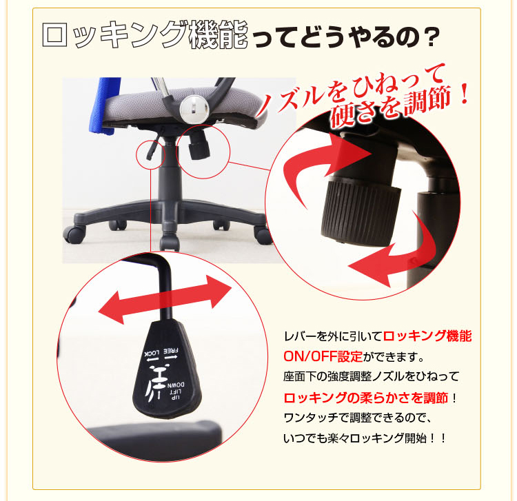 体を伸ばせるロッキング機能、最大10cmまでの高さが可能なガス圧昇降機能、どちらも簡単に調節できます。キャスターも5個付いているので移動もらくらく!