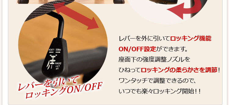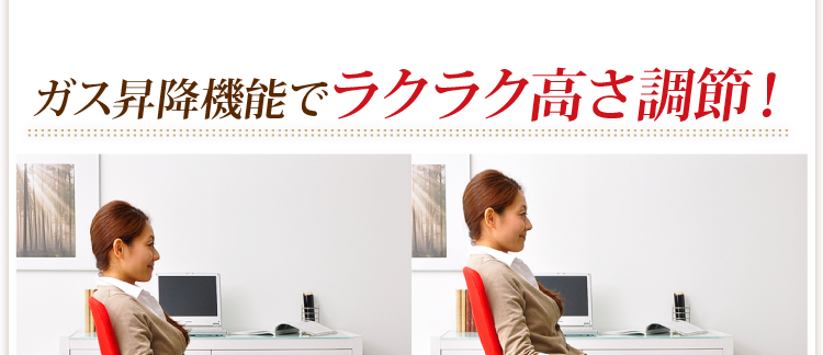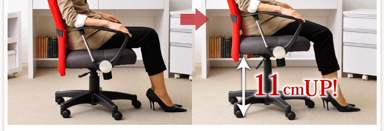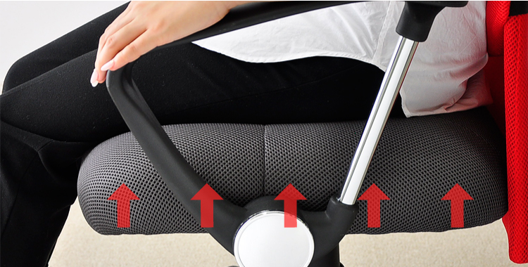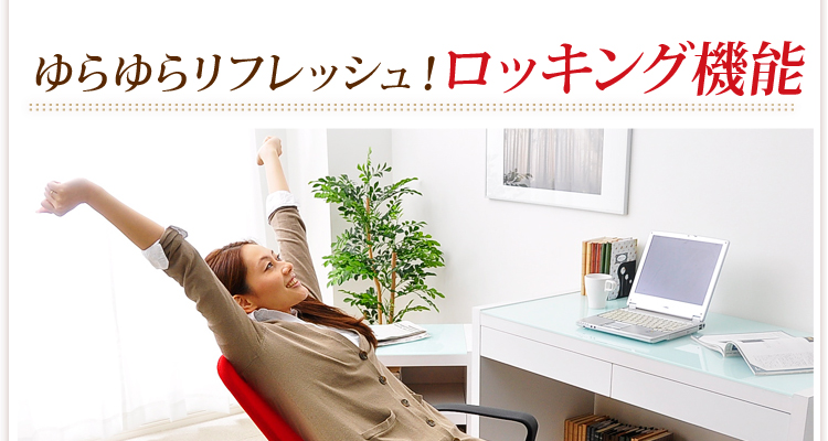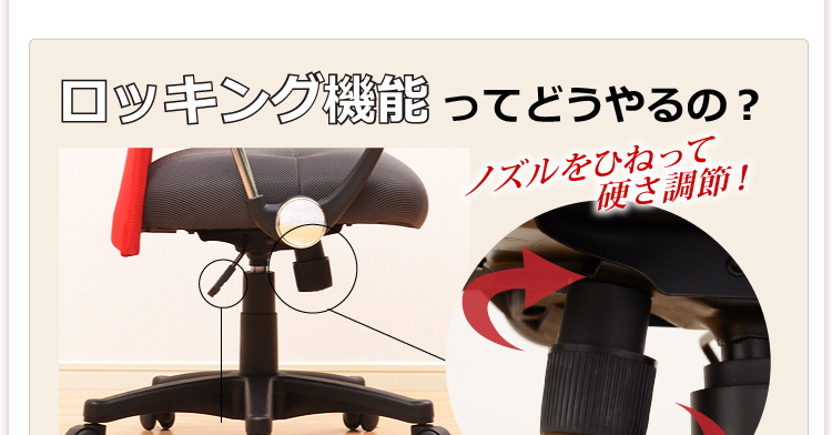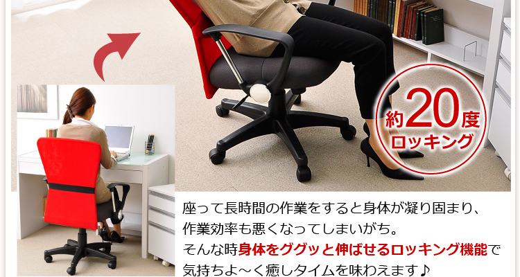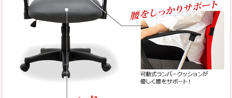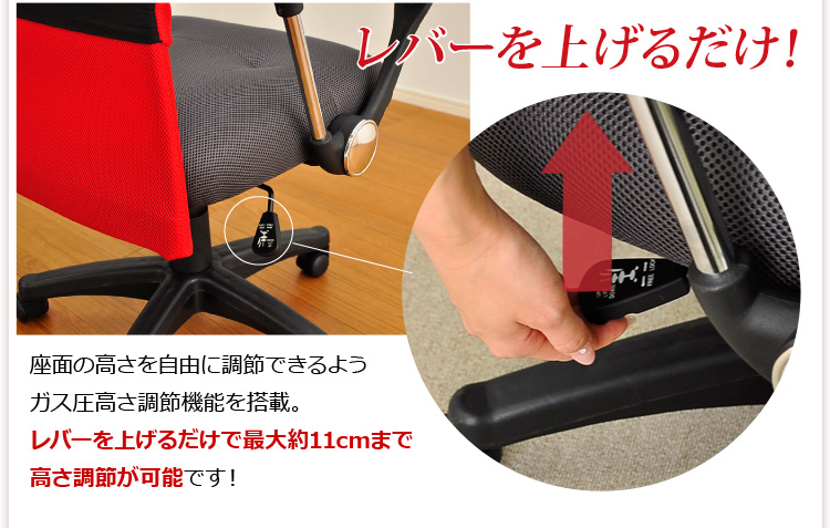 腰や背筋を優しく受け止めてくれる取り外し可能なランバークッション、11cmまで調節できるガス昇降機能、約20度まで身体を伸ばせるロッキング機能と、機能も充実!