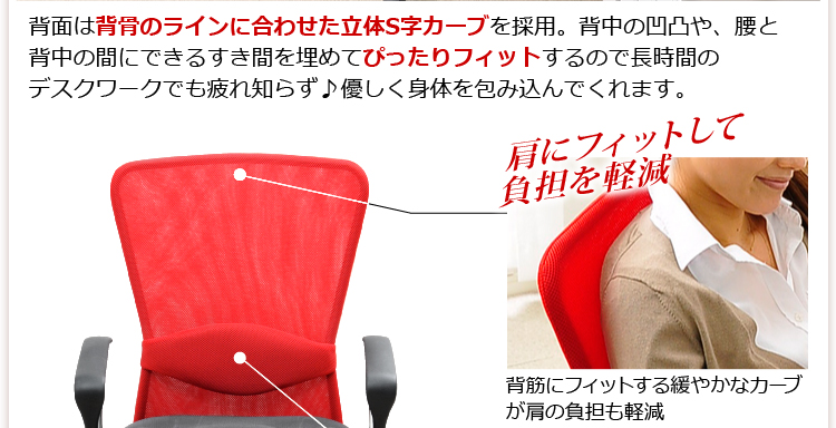背面は背骨のラインに合わせた立体S字カーブで腰と背中のすき間を埋めてぴったりフィット!優しく身体を包み込んでくれるので、疲れず作業もはかどります!