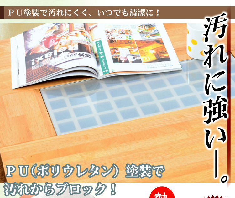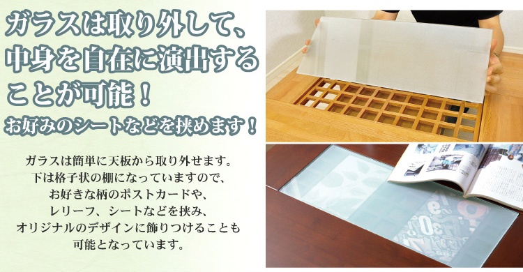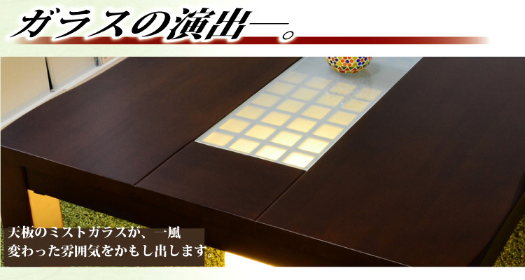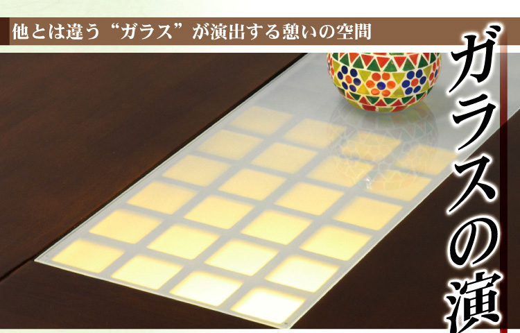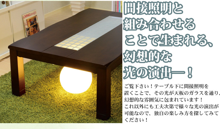 天板中央のミストガラスが他のコタツとは違う雰囲気を出してくれます。間接照明などで下から光を透過させれば幻想的な雰囲気も味わえます!