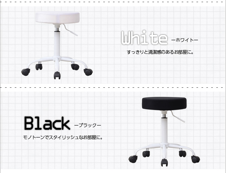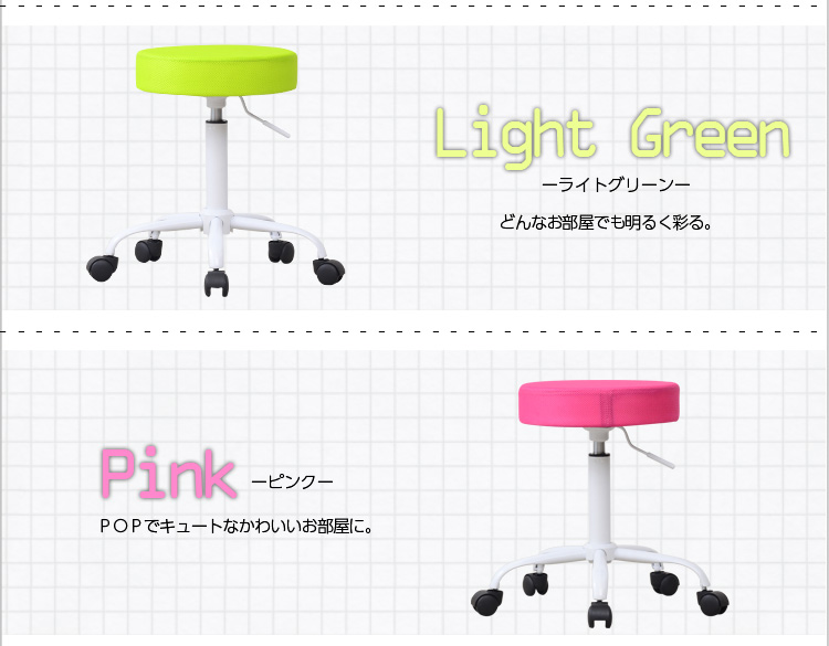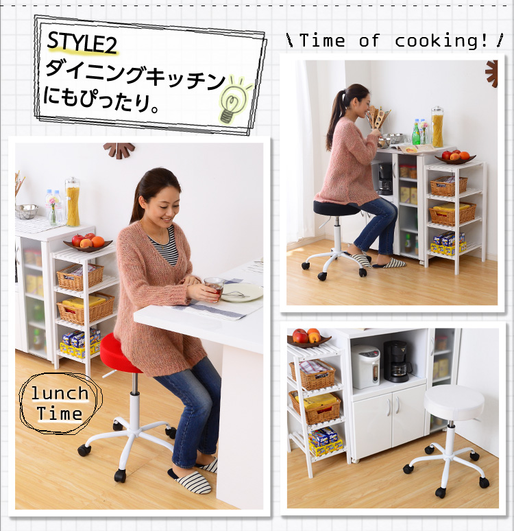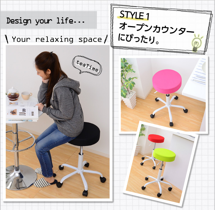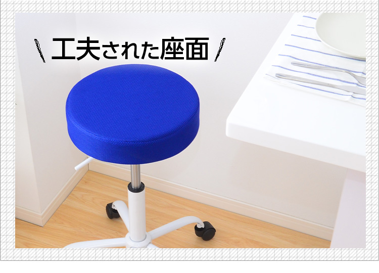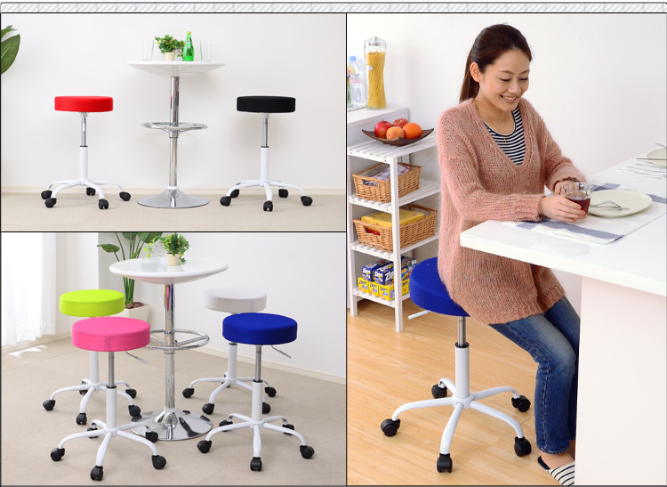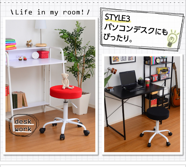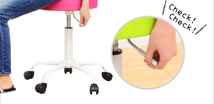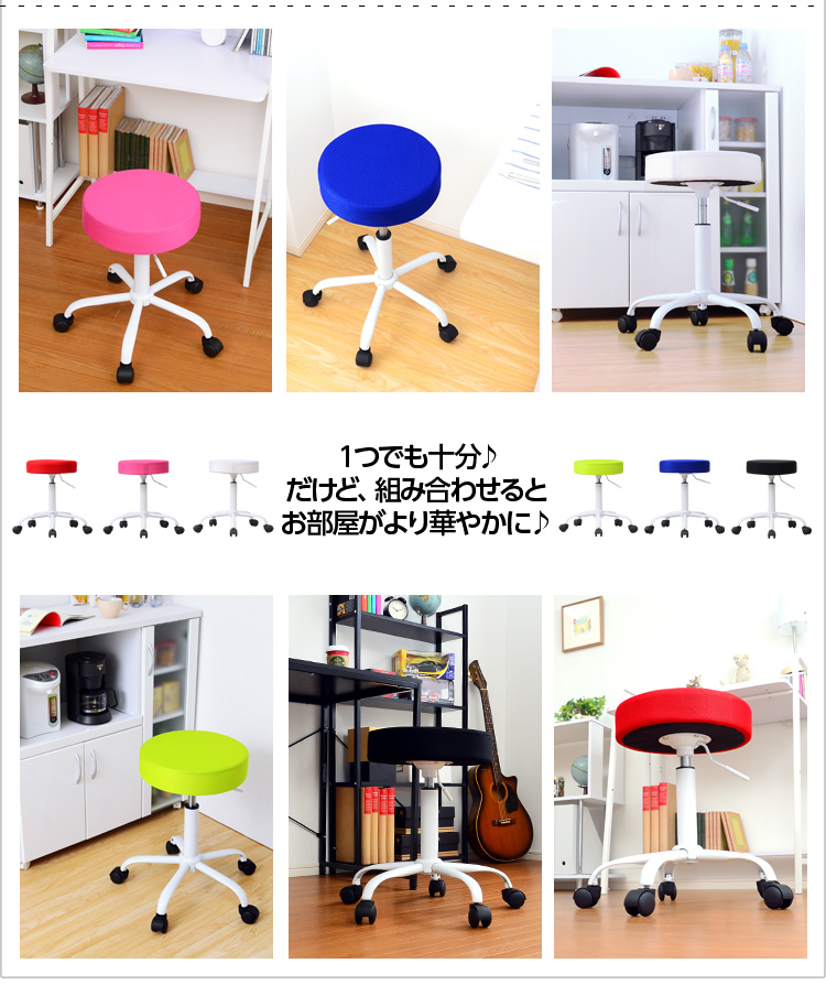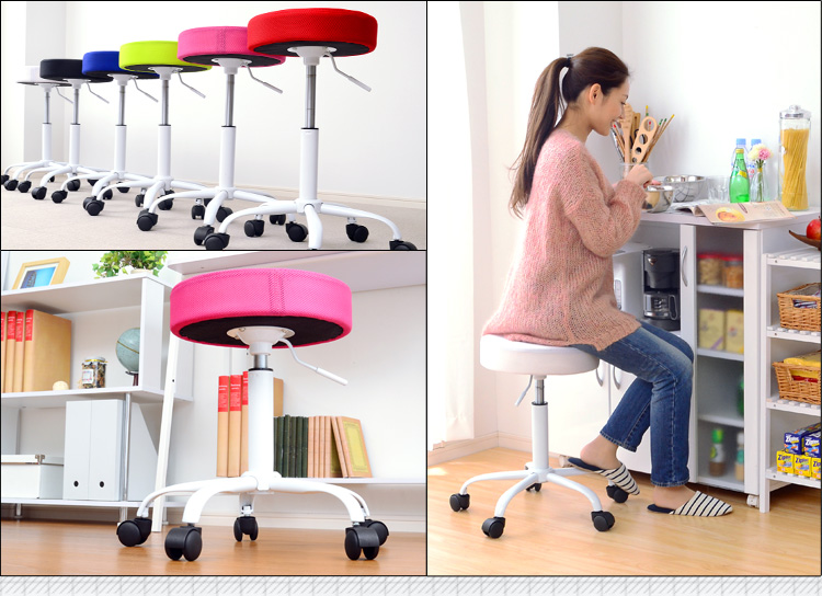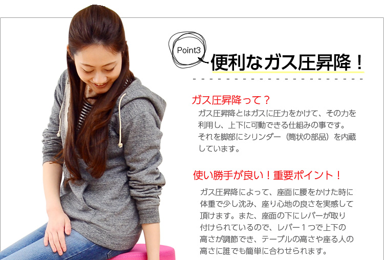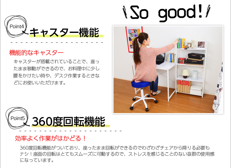 高さを調節する、ガス圧昇降機能、キャスターと360度回転機能もあるので便利!