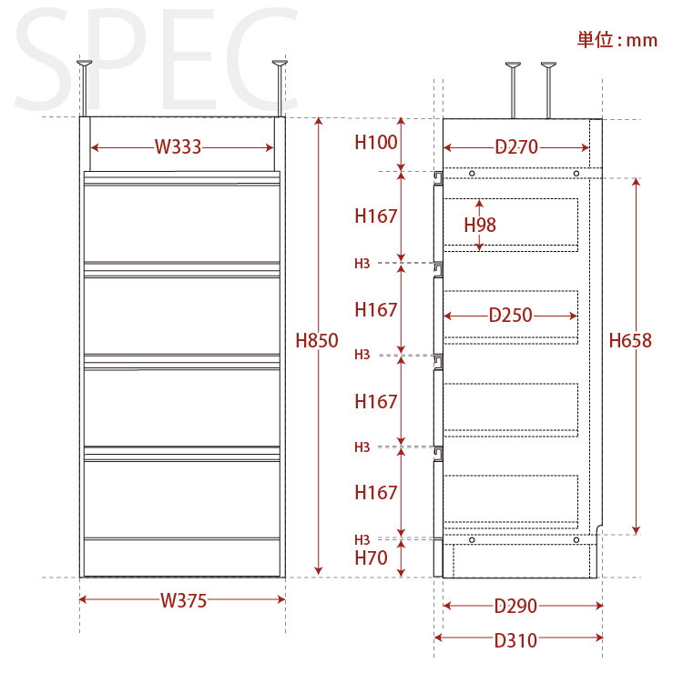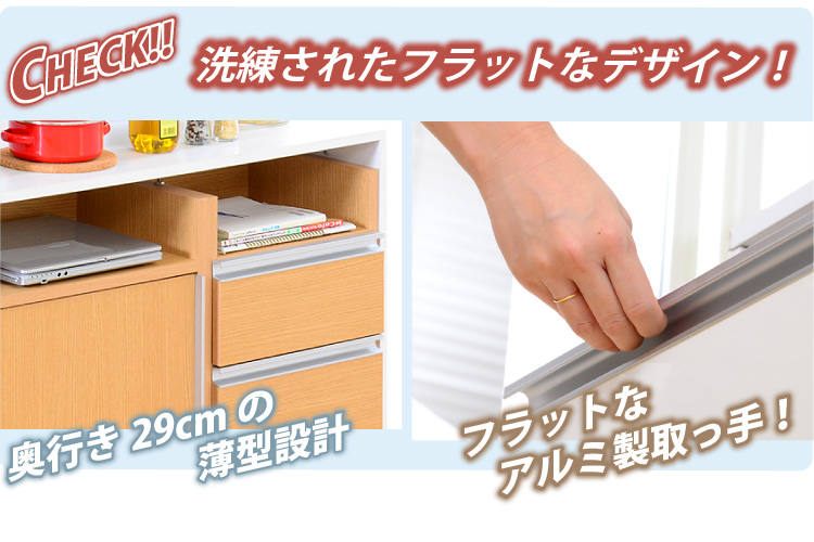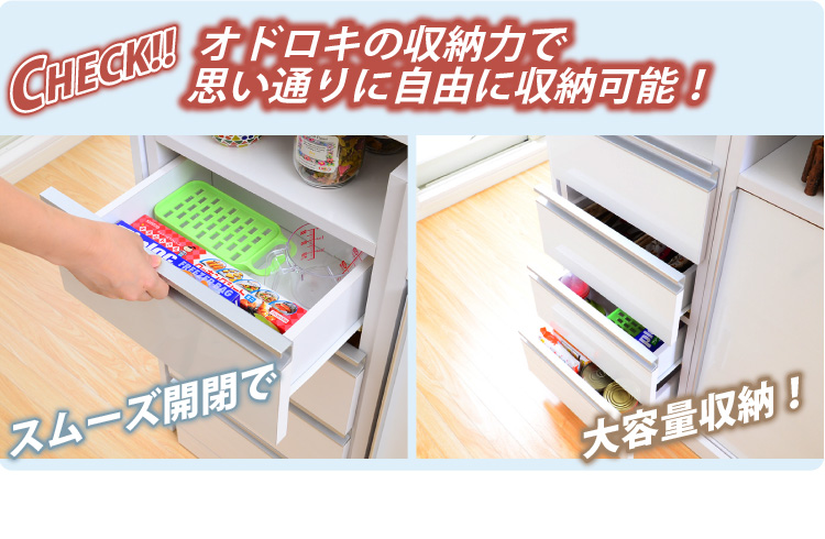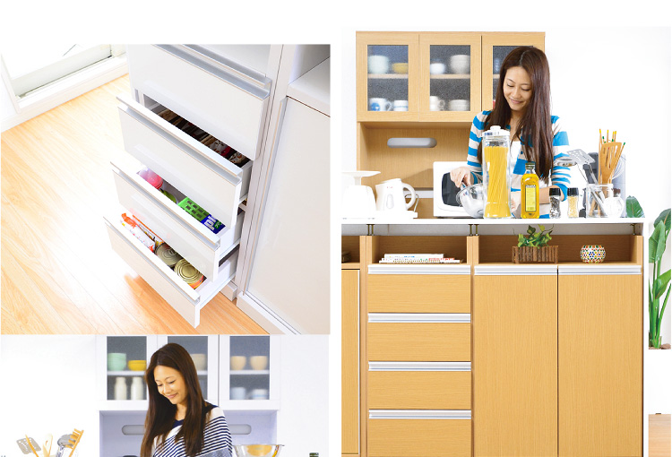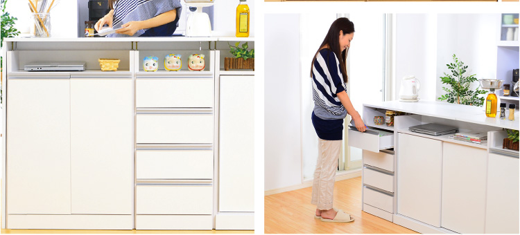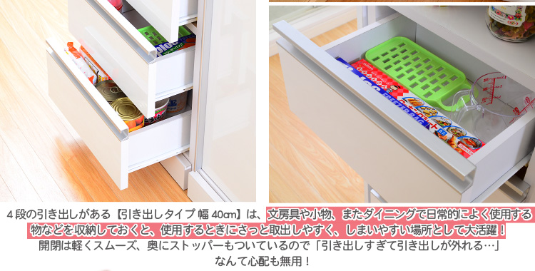 4段の引き出しがあるので、収納力は抜群!文房具や小物、ダイニングで日常的に使用する物を収納しておくと使用するときに取り出しやすく、しまいやすい場所として大活躍です!