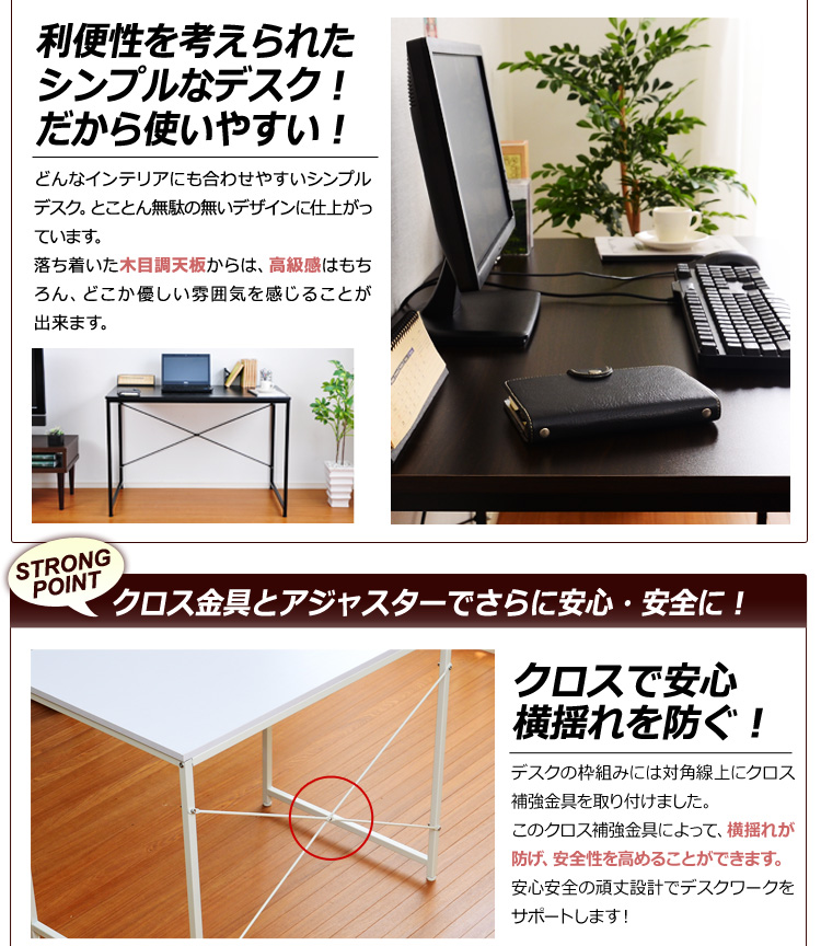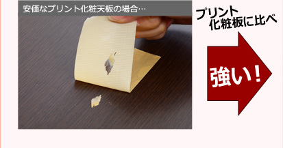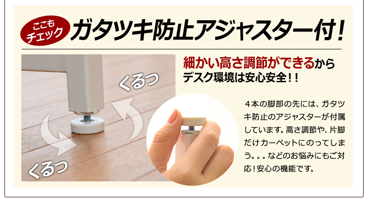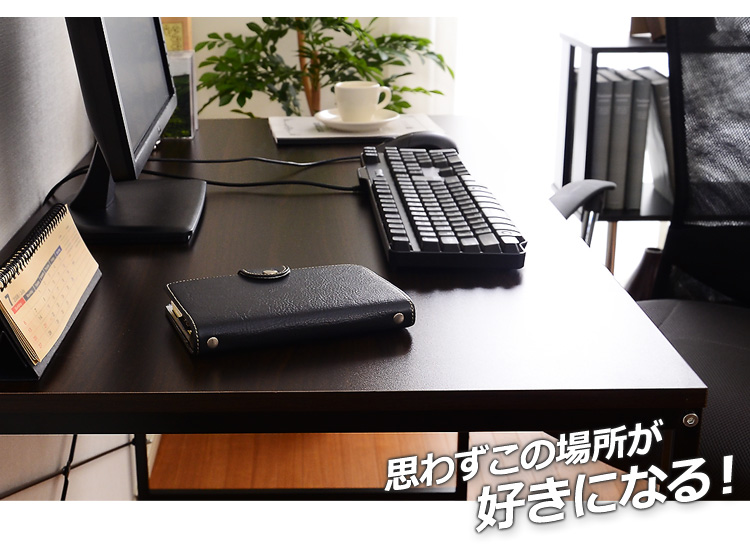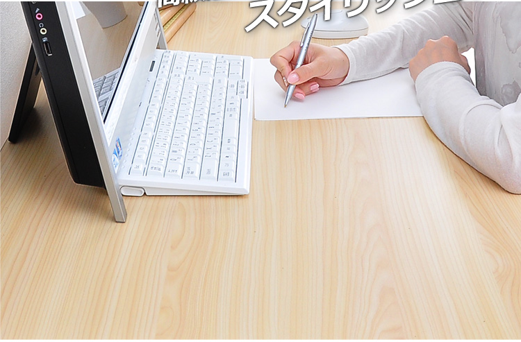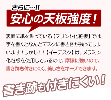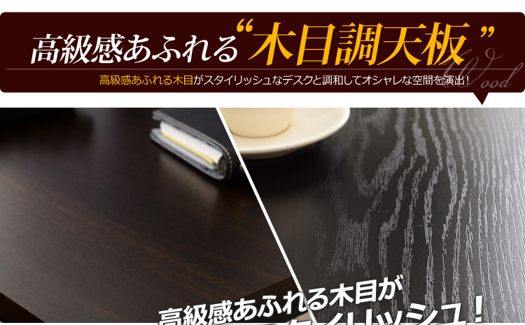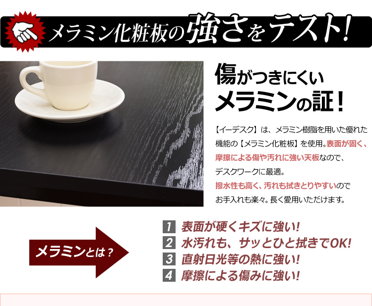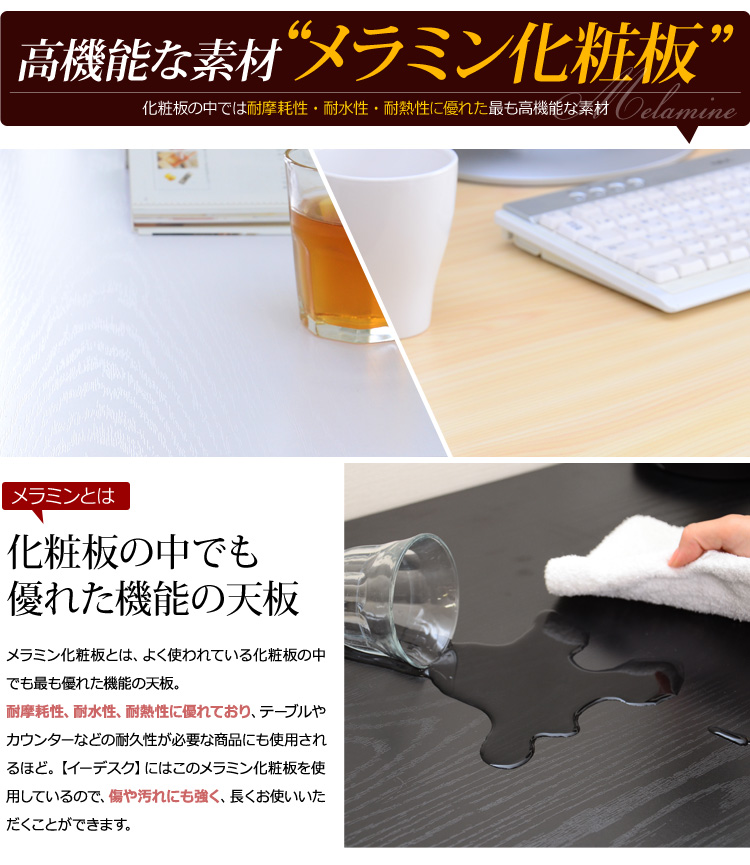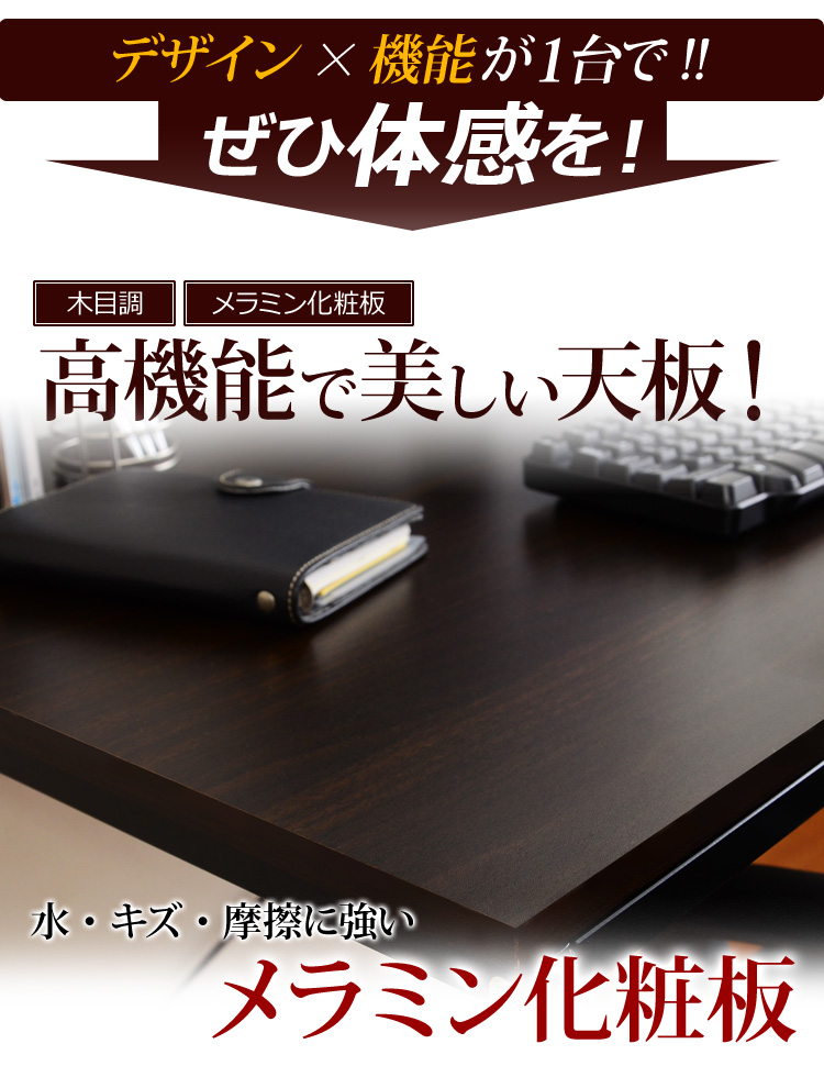 美しい木目調の天板に、摩擦や傷に強く、耐久性にも優れたメラミン加工が施されています。デスクの天板としては最適の加工といわれており、お手入れが簡単、長くご使用いただけます!