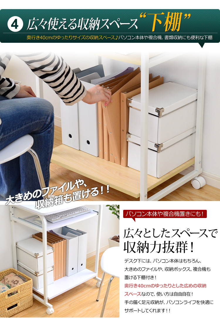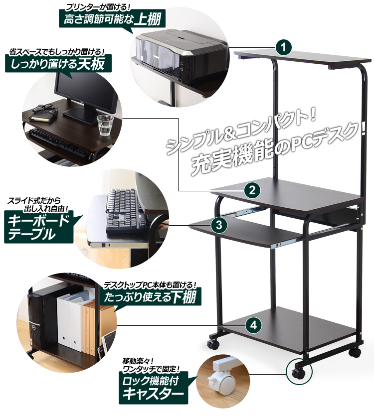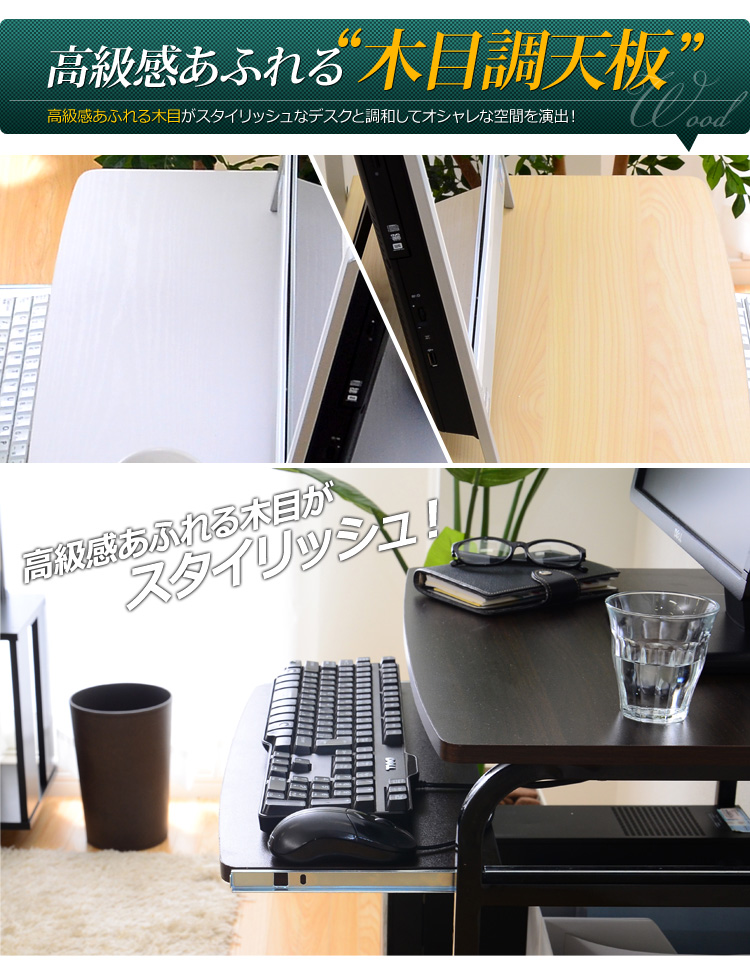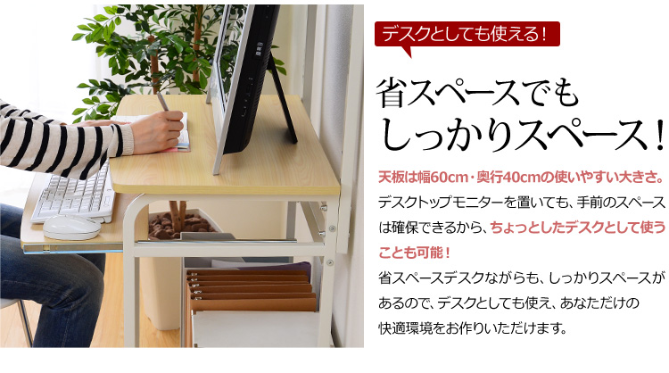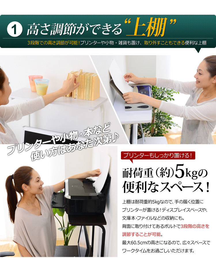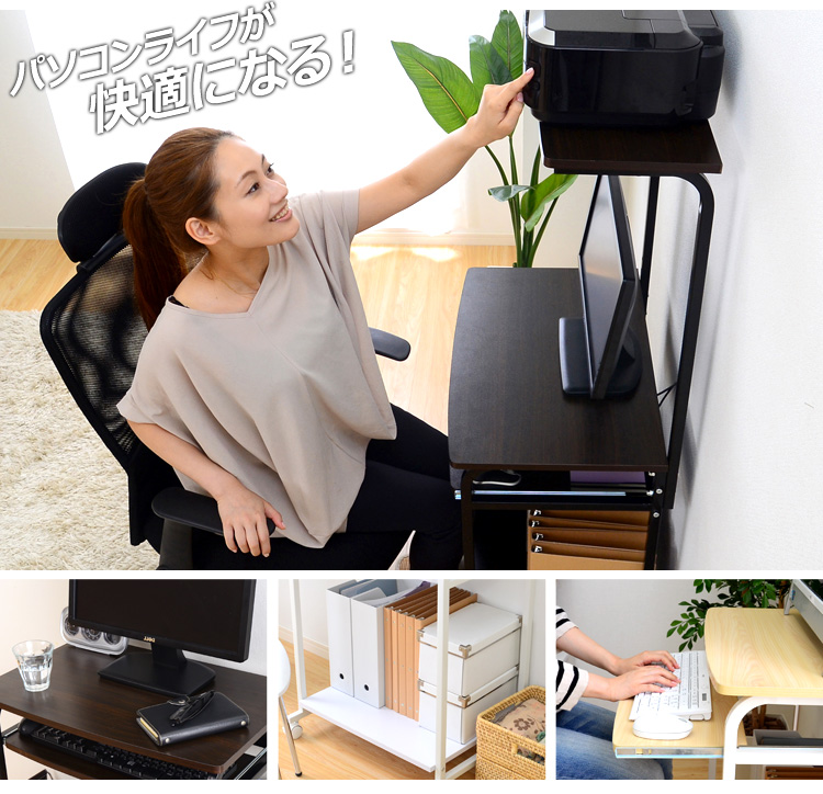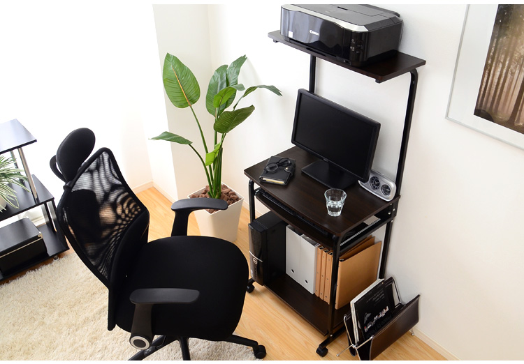 プリンターを置ける上棚、パソコン本体を置くのに最適な下棚、便利な多機能がデスクワークをサポートしてくれます!