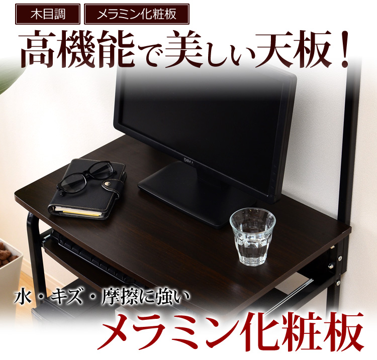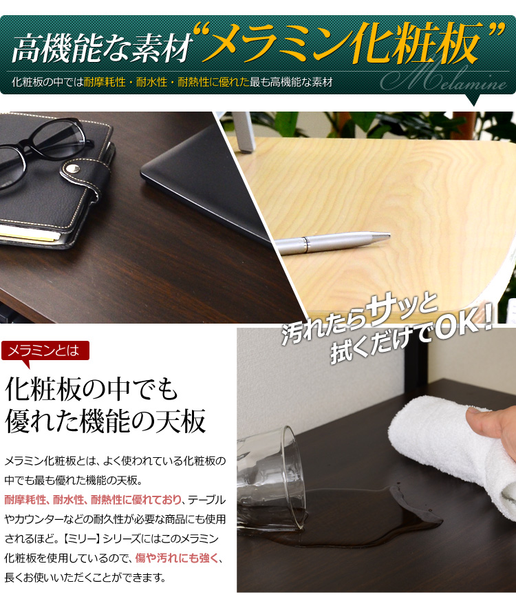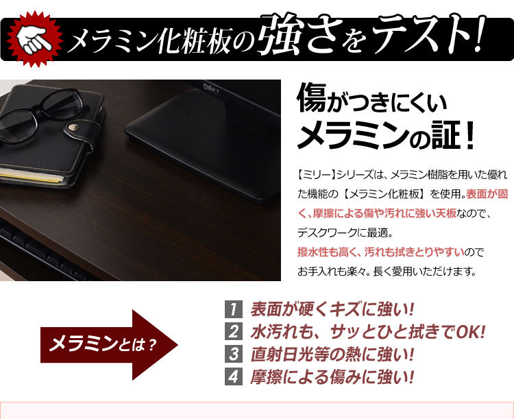 美しい木目調の天板に、摩擦や傷に強く、耐久性にも優れたメラミン加工が施されています。デスクの天板としては最適の加工といわれており、お手入れが簡単、長くご使用いただけます!