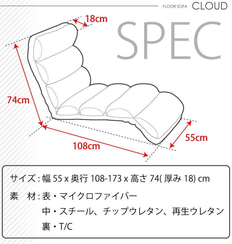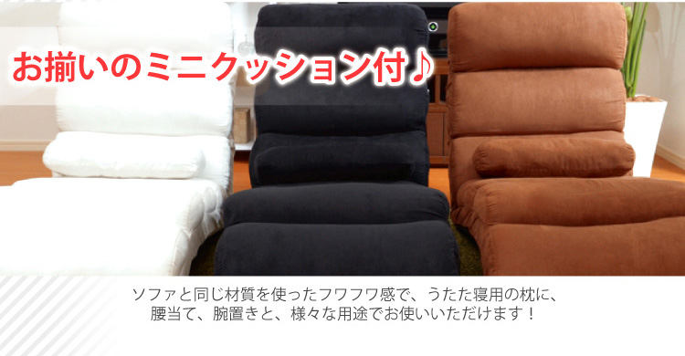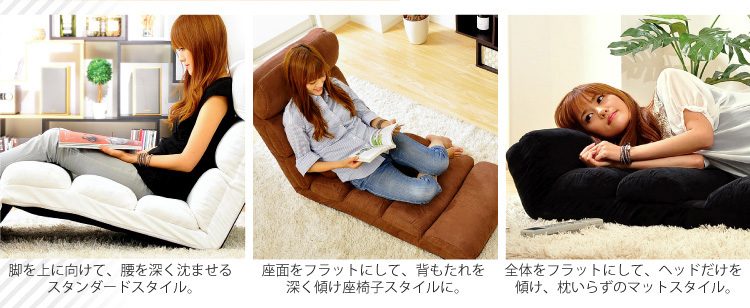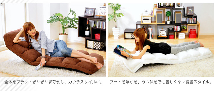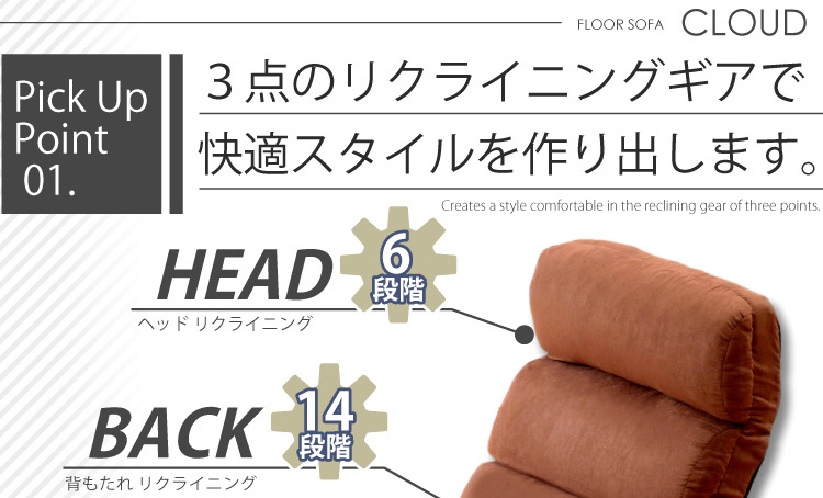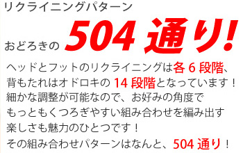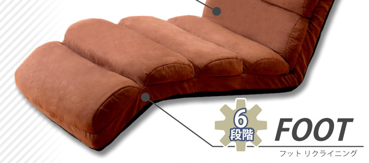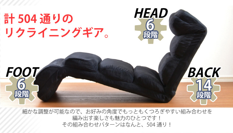 頭が6段階、背もたれが14段階、足が6段階のリクライニング機能があります。何百通り以上のリクライニングパターンからお好きな組み合わせでおくつろぎ下さい!