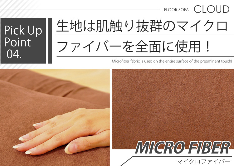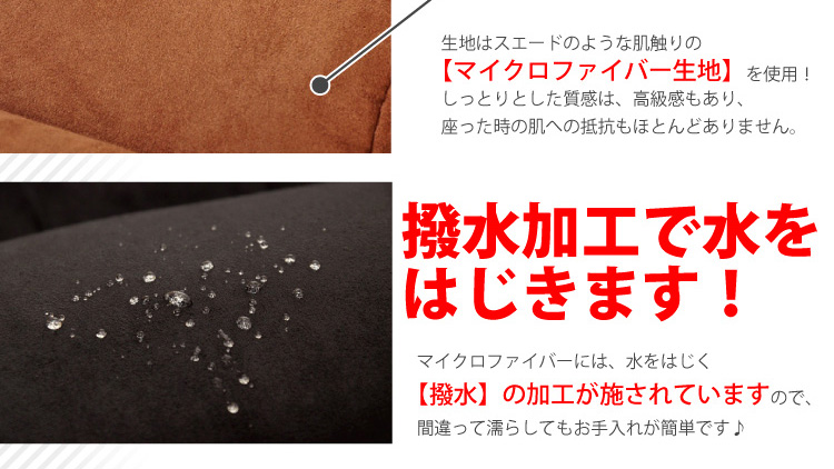 座った時の肌への抵抗もほとんどない、高級感のあるしっとりとした質感のマイクロファイバー生地を使用しています。撥水加工も施しているので、もし濡らしてもお手入れが簡単!