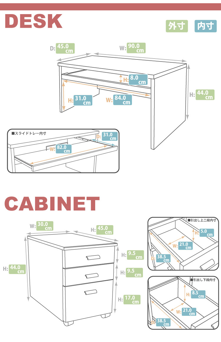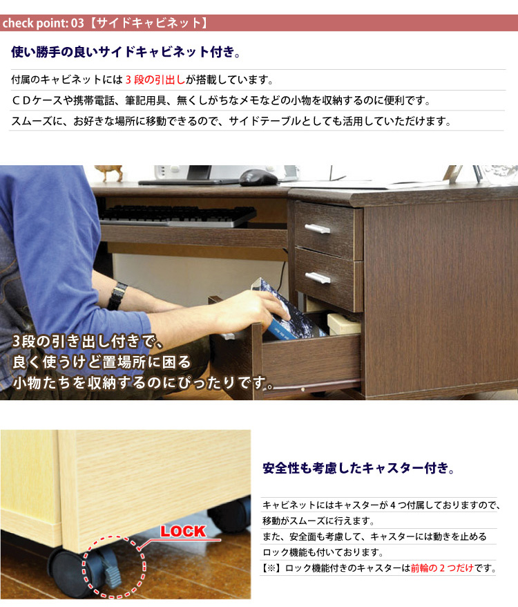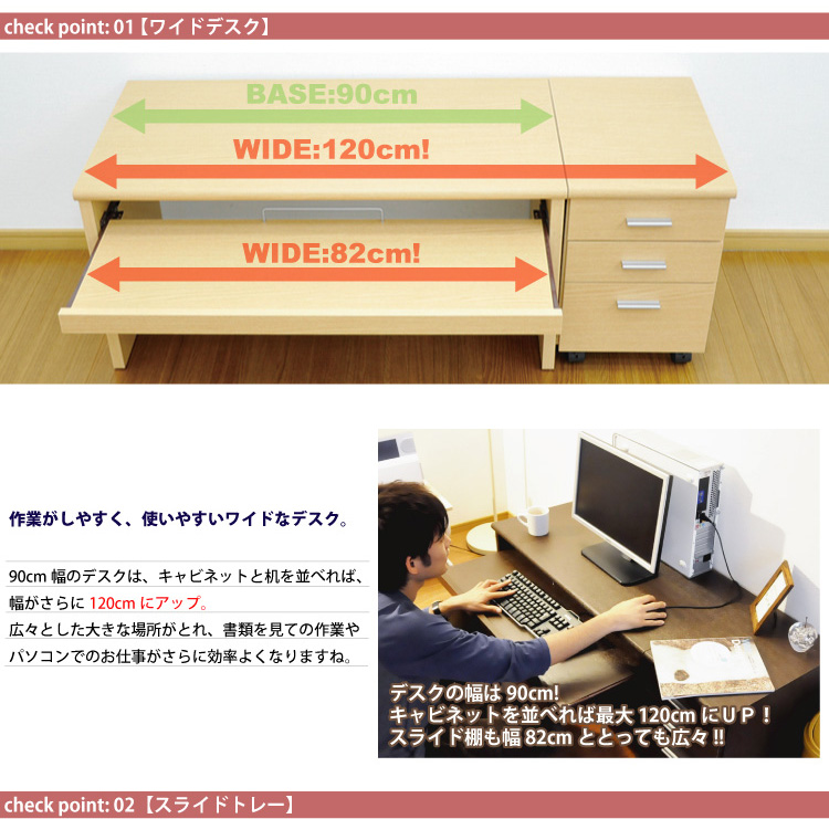 幅が90cmあるのでパソコンを置いたり勉強机にしたりと使い勝手は抜群です。キャビネットと合わせれば120cm幅のワイドタイプとしてもお使いいただけます。