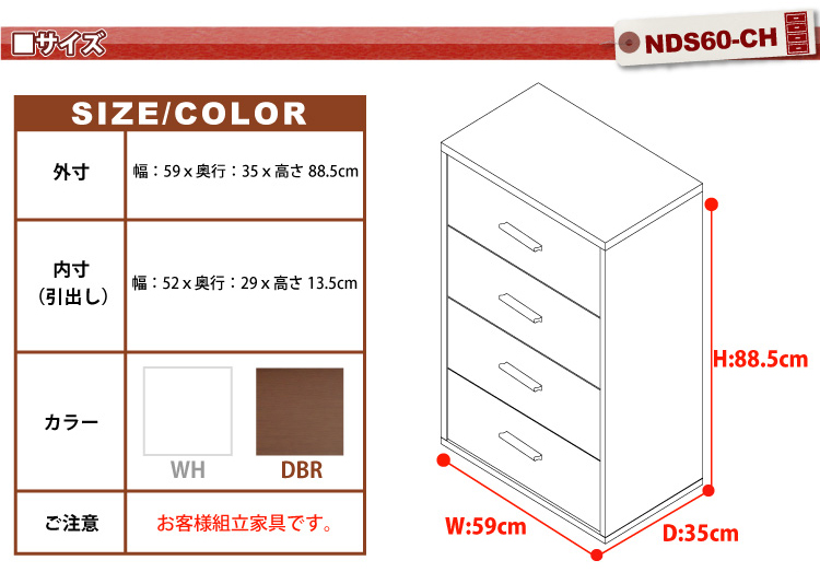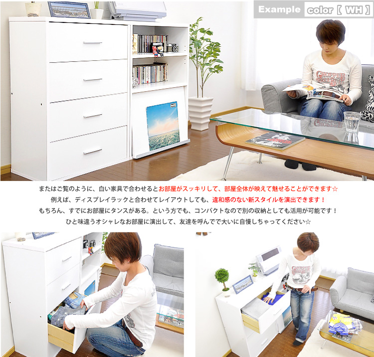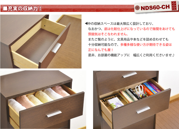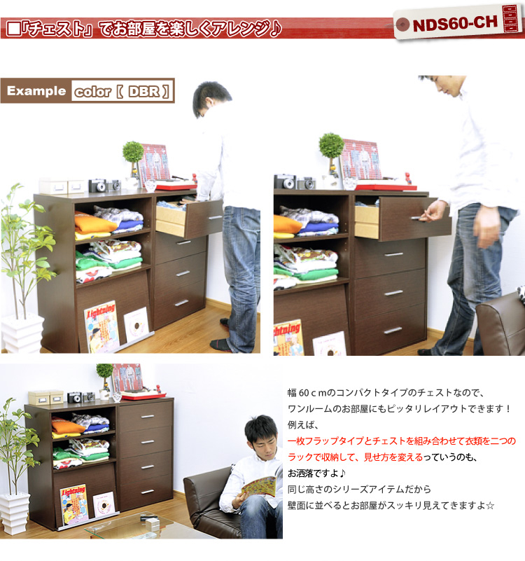 ファミリーから一人暮らしのお部屋まで幅広くお使いいただける、コンパクトタイプのチェストです。服や小物をスッキリ収納できます!