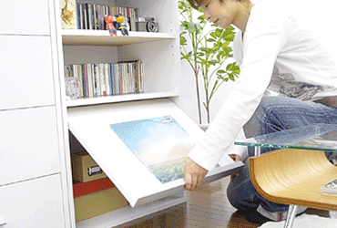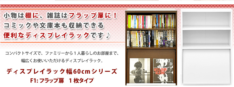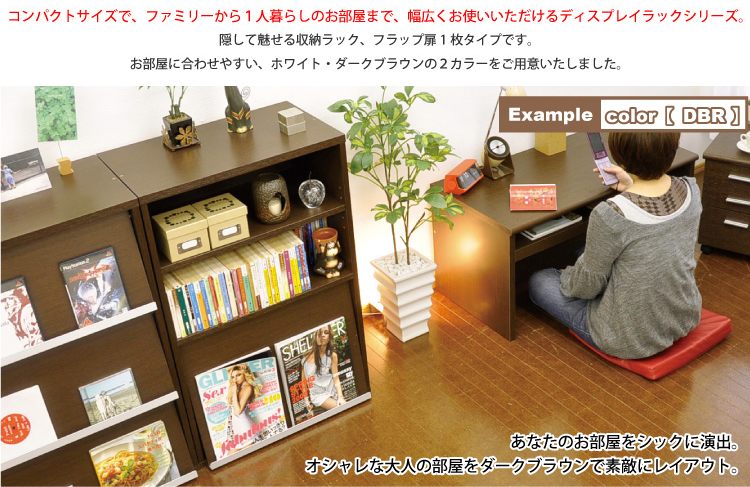 ファミリーから一人暮らしのお部屋まで幅広くお使いいただける、1枚のフラット扉が付いたディスプレイラックです。本やCD、DVDを収納するのに便利です!