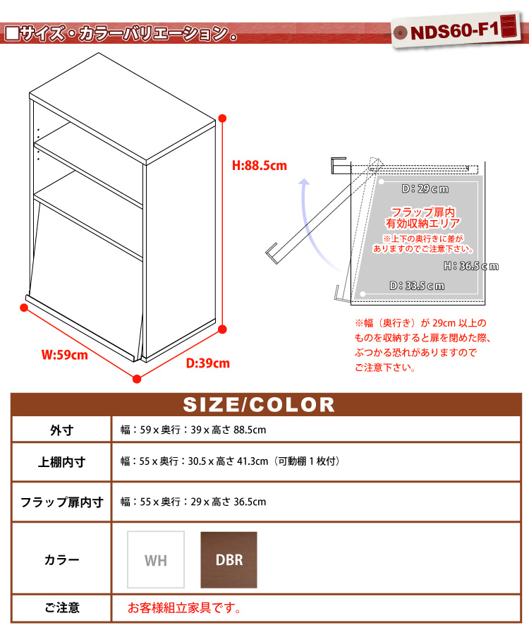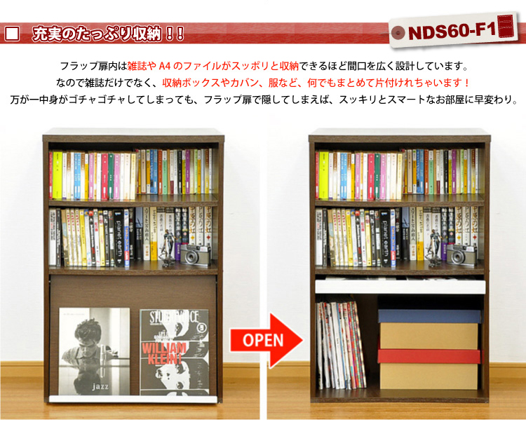 上部の棚は中央が可動棚なので、収納する高さに合わせて調節できます。フラップ扉内はA4サイズのファイルがすっぽりと入る間口になっているので、カバンや服なども収納できます!