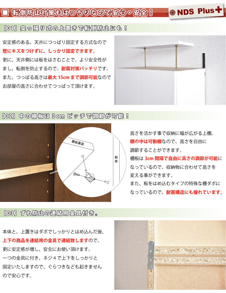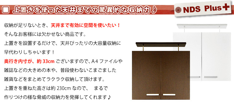 天井まで有効に活用できる60cm幅の上棚です。突っ張り式の上置きなので転倒防止にもなり、安心してお使いいただけます。