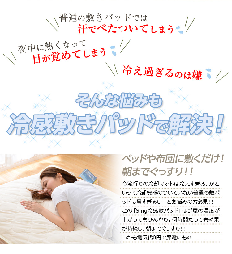 寝苦しい夜にはエアコンを付けっぱなし…なんてこともありますが、エアコンの苦手な方もいらっしゃいますよね。扇風機や自然の風に加えひんやり敷パッドを使用すれば、寝苦しい夜も涼しく過ごせます。