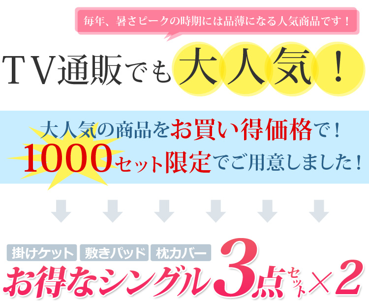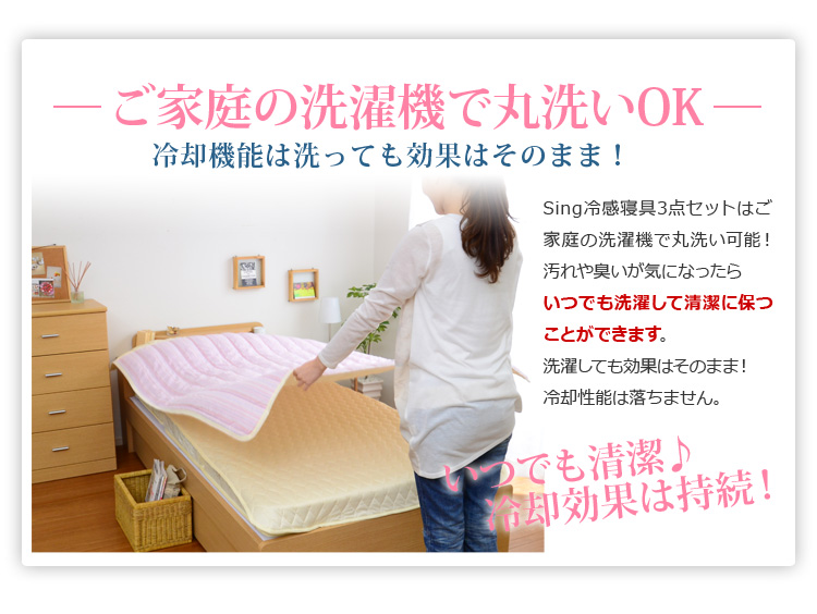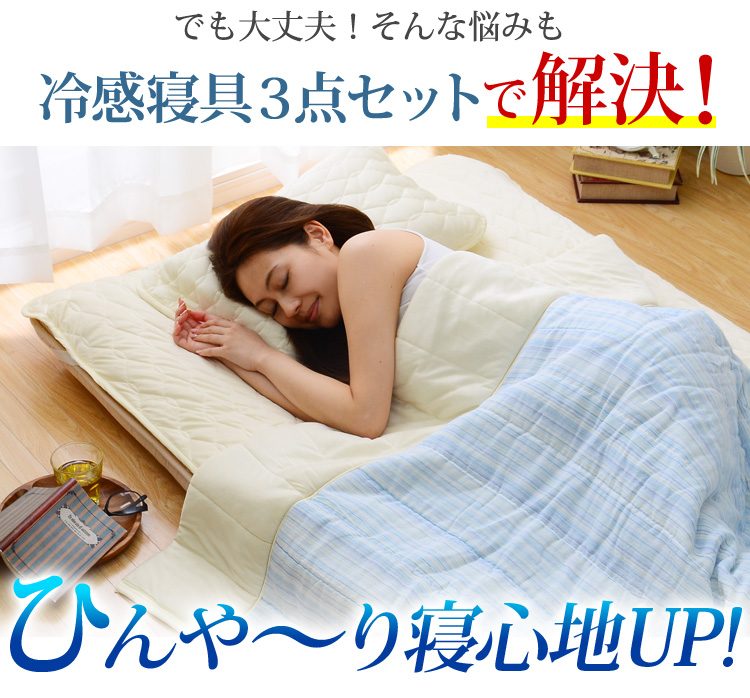 冷感寝具シングルの掛けケット、敷きパッド、枕カバーの3点を2組セットで!丸洗いが出来るので、いつでも清潔に眠ることができます!