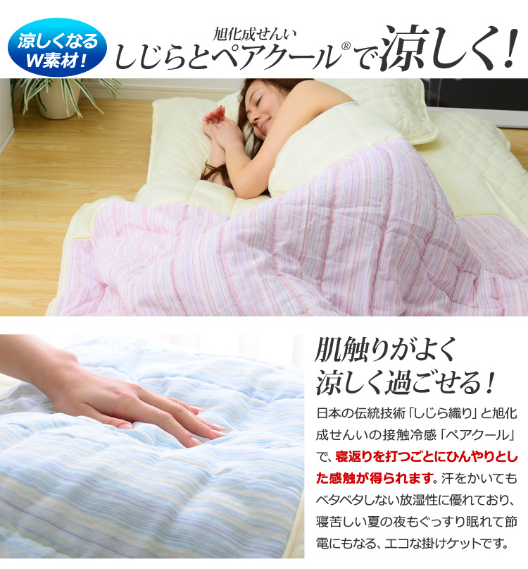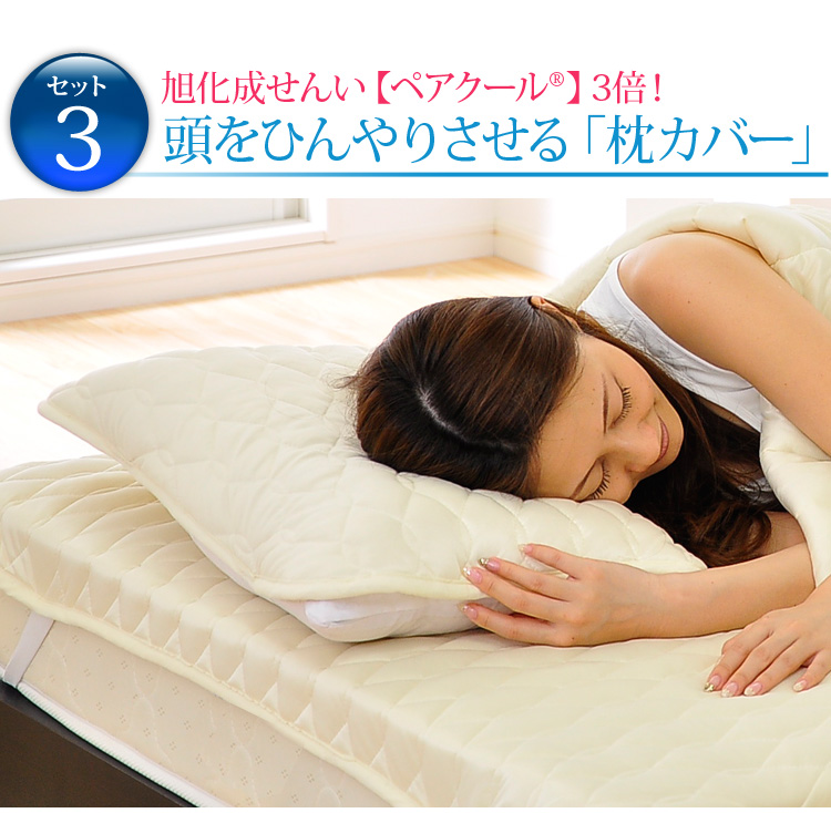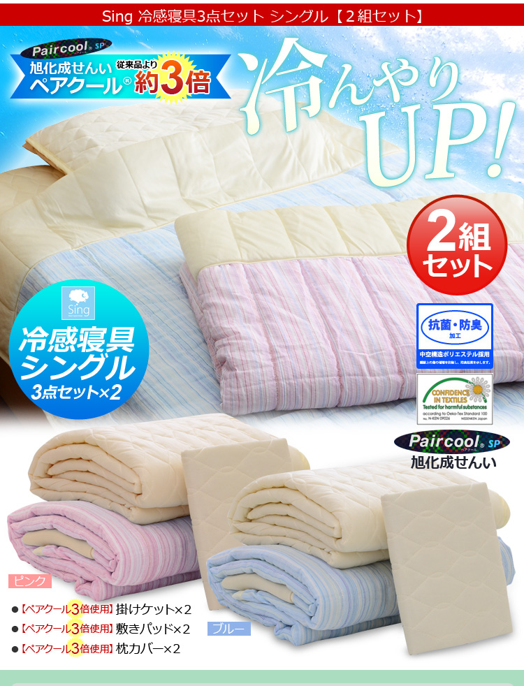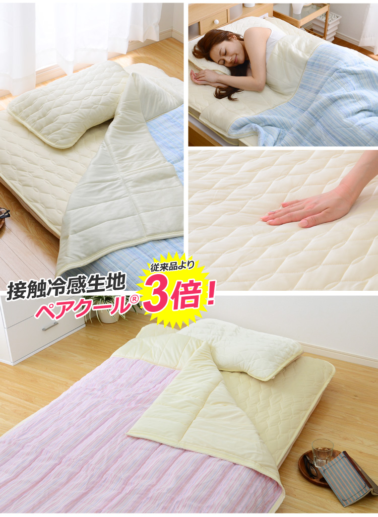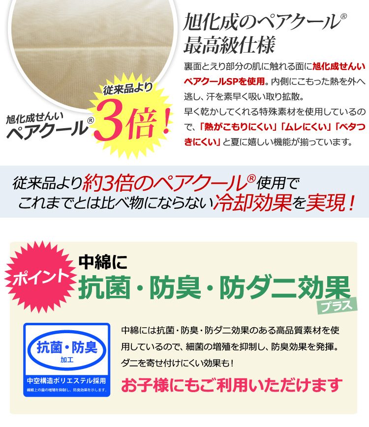 敷きパッド、掛けケットの裏面とえり部分、枕にはペアクールを使用しております。高いクーリング機能と吸放湿性を兼ね備えた、夏には嬉しい機能!肌触りも抜群です!