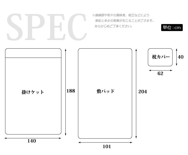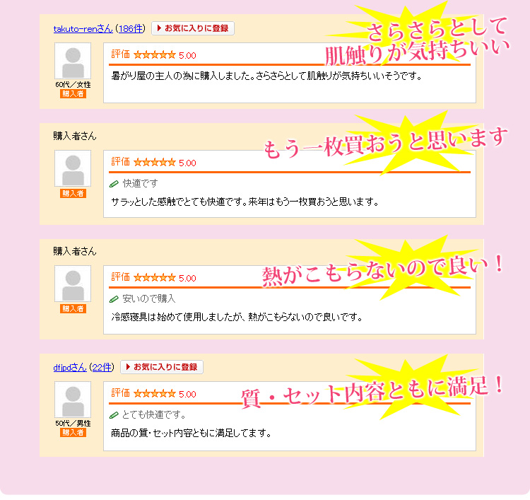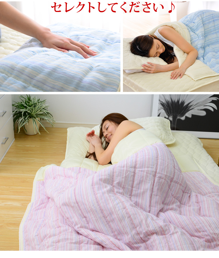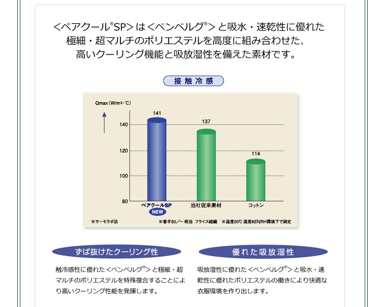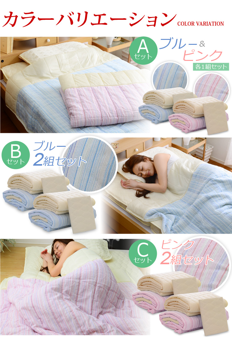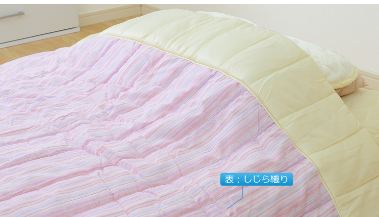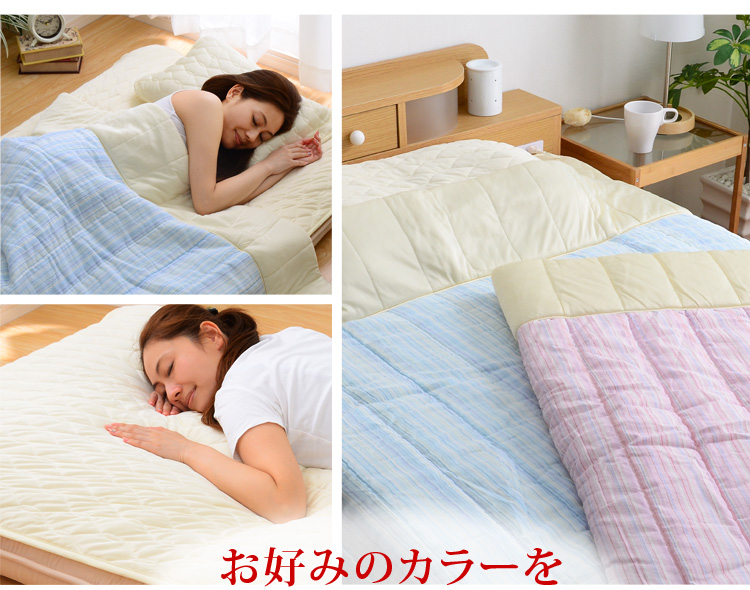 敷きパッド、掛けケットの裏面とえり部分、枕にはペアクールを使用しております。高いクーリング機能と吸放湿性を兼ね備えた、夏には嬉しい機能!肌触りも抜群です!