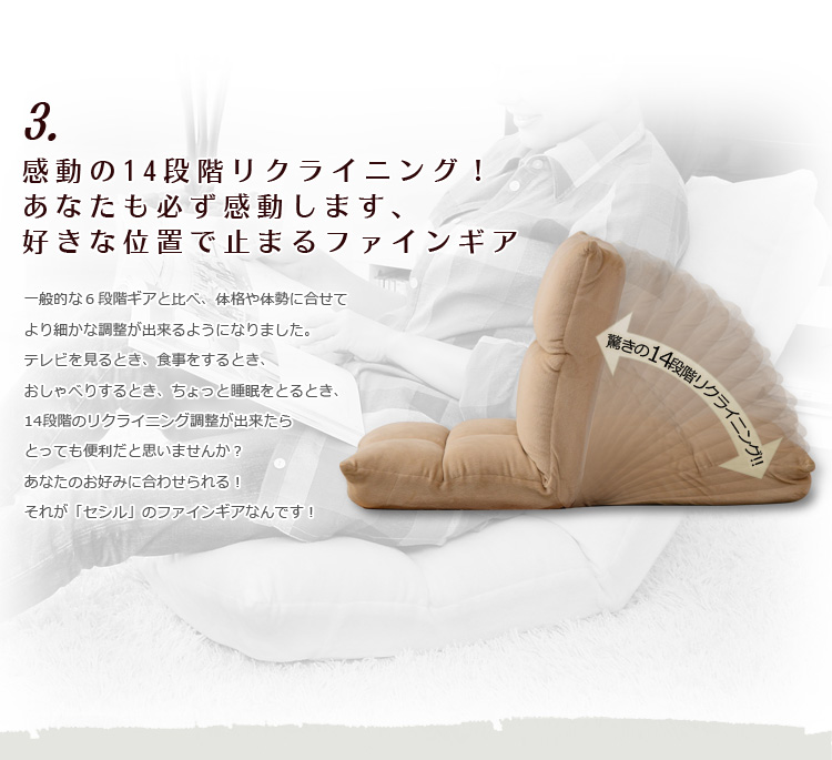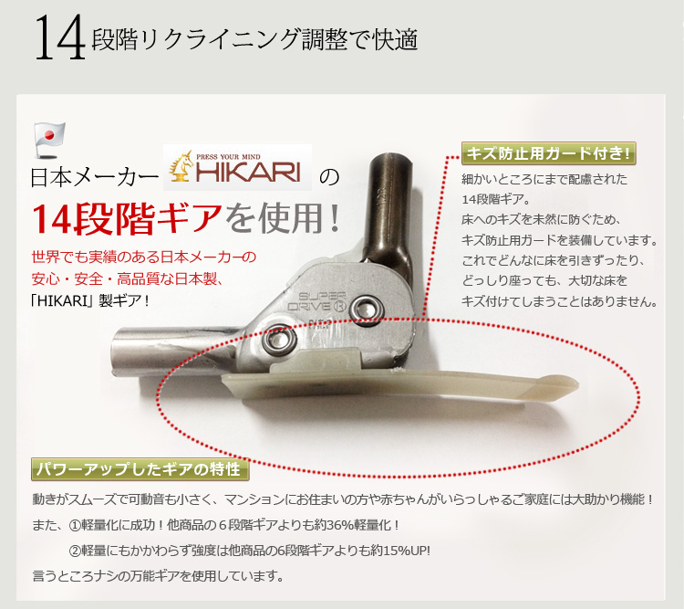 体格や体勢に合わせて細かな調整ができる、14段階のリクライニング機能!お好きな位置で止まるファインギアです!
