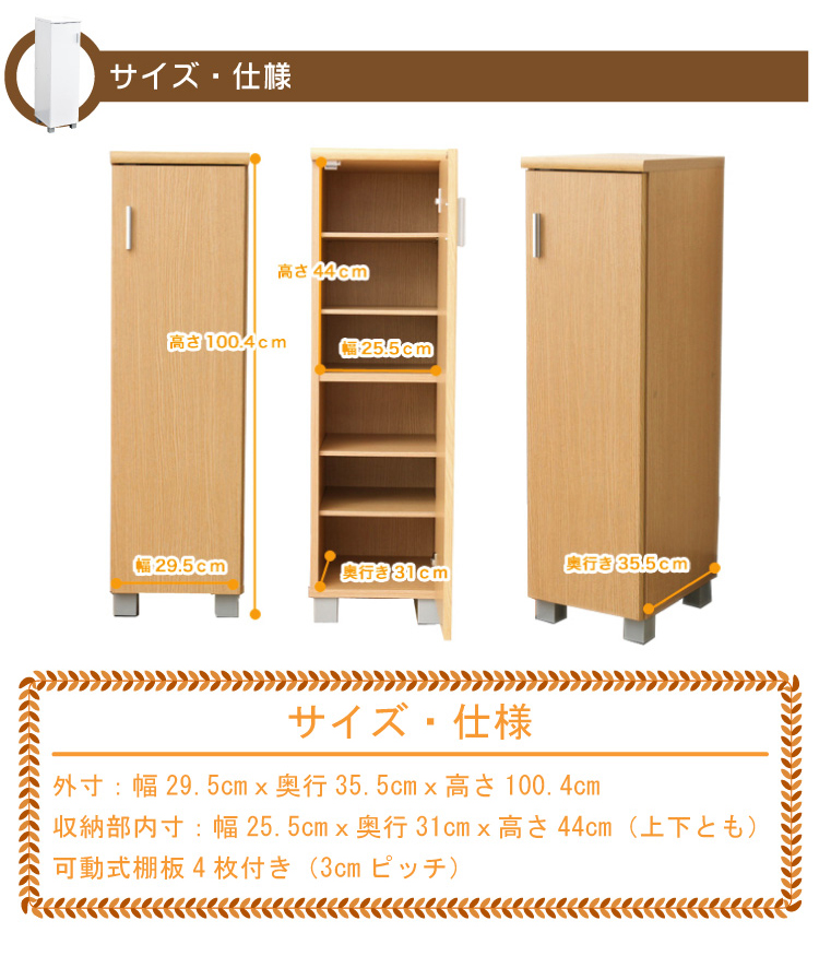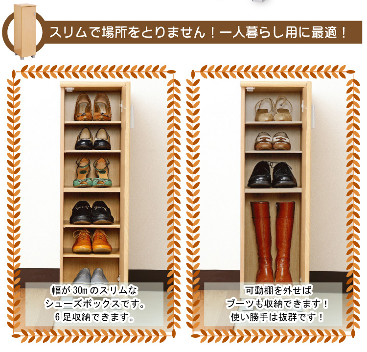 一人暮らしに最適!幅が30cmのスリムなシューズボックスです。可動棚なのでブーツも収納でき、使い勝手は抜群!