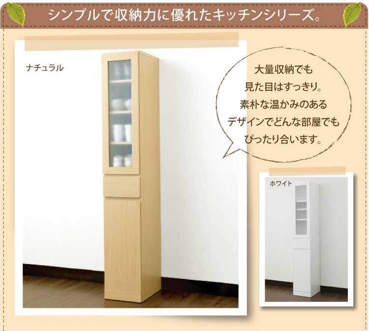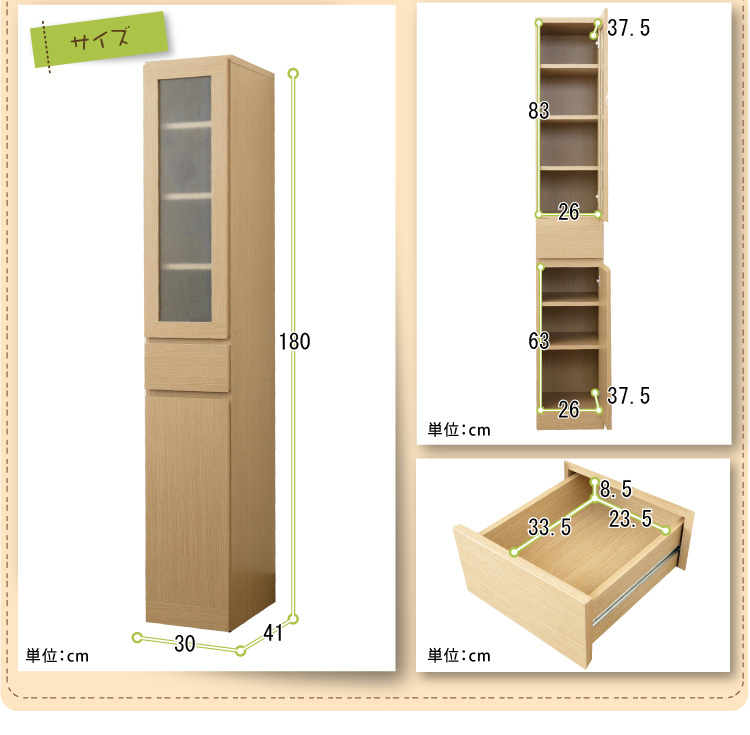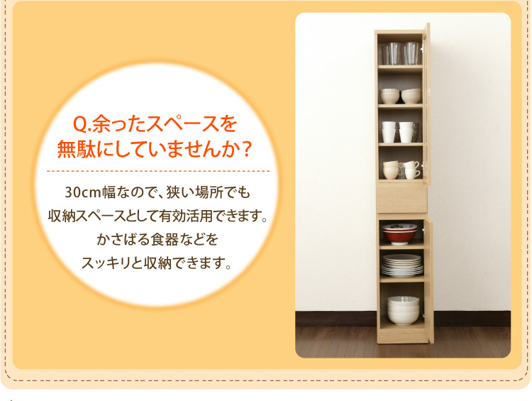 大量収納でもスッキリしたナチュラルラインなデザインで使う場所を選びません。30cm幅なので、狭い場所でも収納スペースとして有効活用できます!