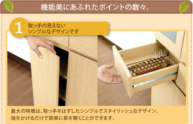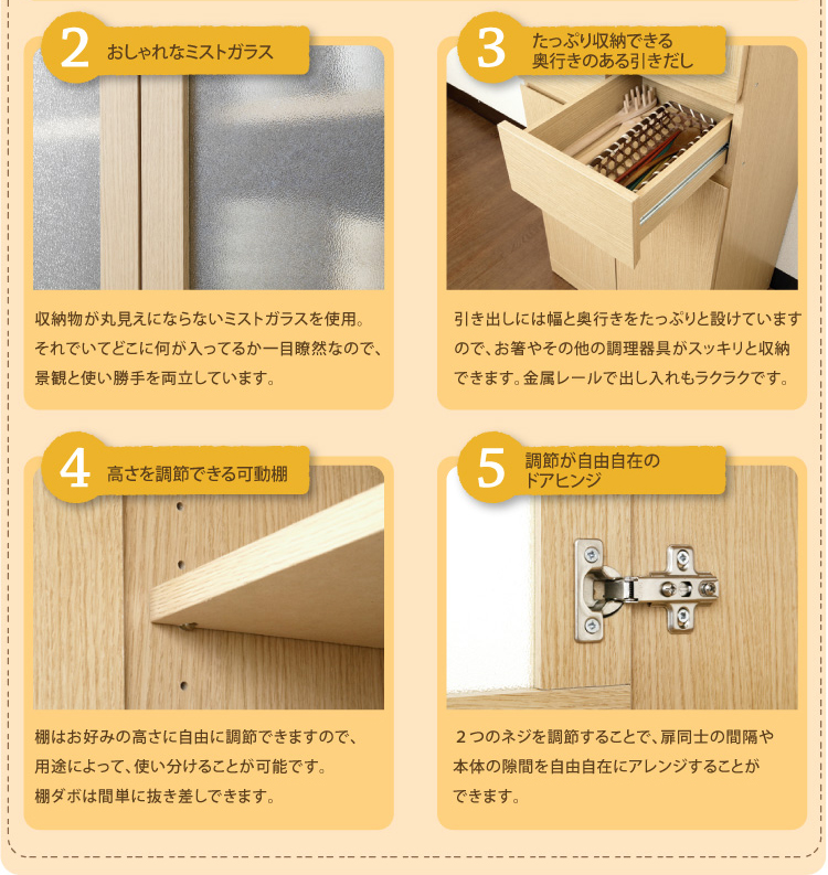 引き出しには幅と奥行きをたっぷり設けているので、調理器具がスッキリと収納できます。棚は自由に高さを変えられる可動棚なので、用途に合わせて使い分けられます。