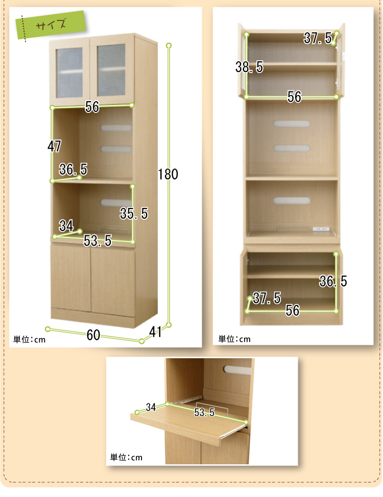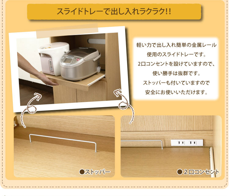 電子レンジを置ける台、炊飯器やポッドを置けるスライドトレーは2口コンセントがあり使い勝手抜群、棚は自由に高さを変えられる可動棚なので、用途に合わせて使い分けられます。