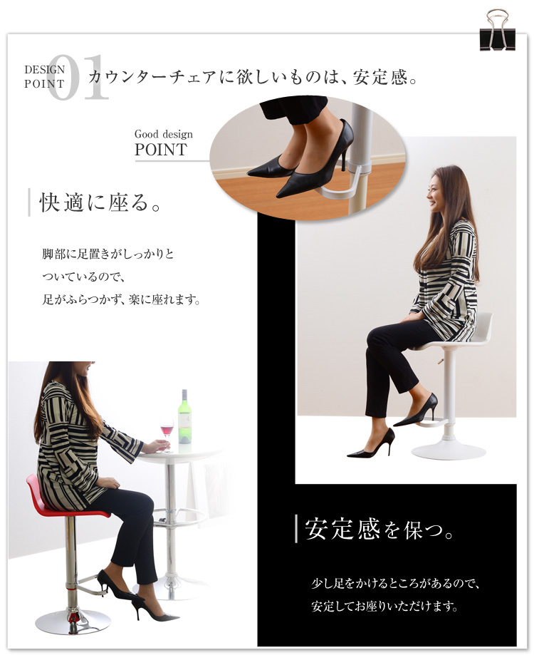 脚部に足置きが付いているので、足がふらつかず、楽に座れます。少し足をかけるところもあるので、安定してお座りいただけます。