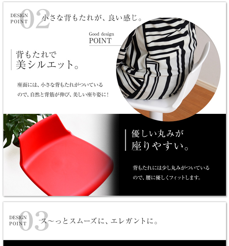 座面には少し丸みを帯びた背もたれがついているので、自然と背筋が伸び、美しい座り姿になります。