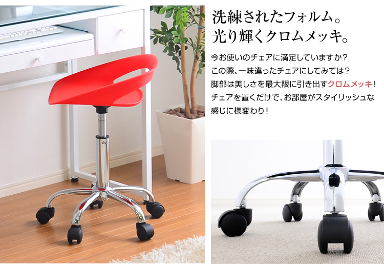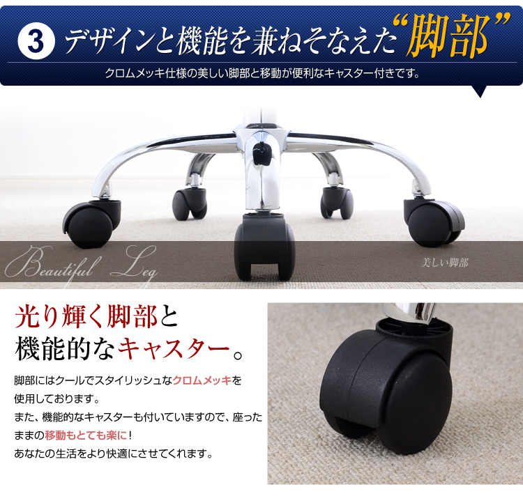 脚部には美しさを最大限に引き出すクロムメッキを使用しています。そして、機能的なキャスターも付いていますので移動も楽に、快適にさせてくれます。